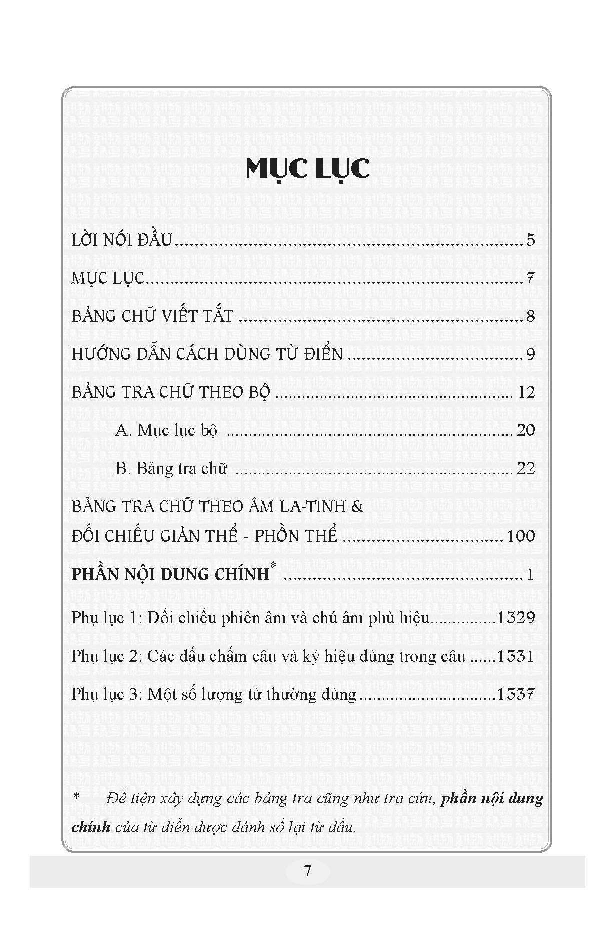 Phần chính của từ điển được xếp theo âm đọc phổ thông ghi bằng chữ cái La-tinh. Để tiện tra cứu, từ điển sử dụng các cách tra: theo bộ và theo âm đọc. Bảng tra chữ theo bộ có nhiều cải tiến để giúp bạn đọc nhanh chóng và thuận tiện hơn nữa trong việc tra chữ. Phần phụ lục chứa nhiều thông tin thiết thực chắc chắn sẽ làm bạn đọc hài lòng khi sử dụng.