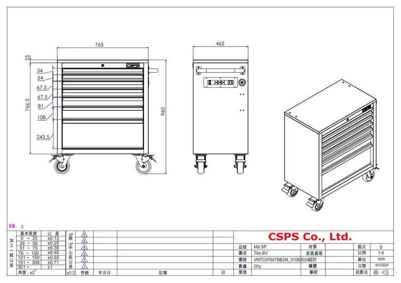 Tủ dụng cụ CSPS 61cm - 04 hộc kéo màu đen bánh xe (tay cầm trắng) THÔNG SỐ KỸ THUẬT: 1.THÔNG SỐ CHUNG Kích thước đóng gói/ Package dimension: 62cm W x 43cm D x