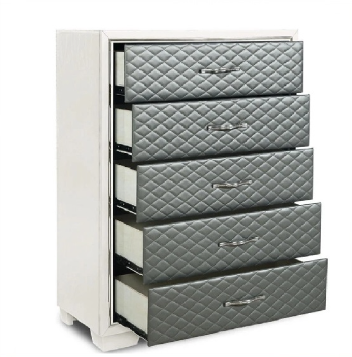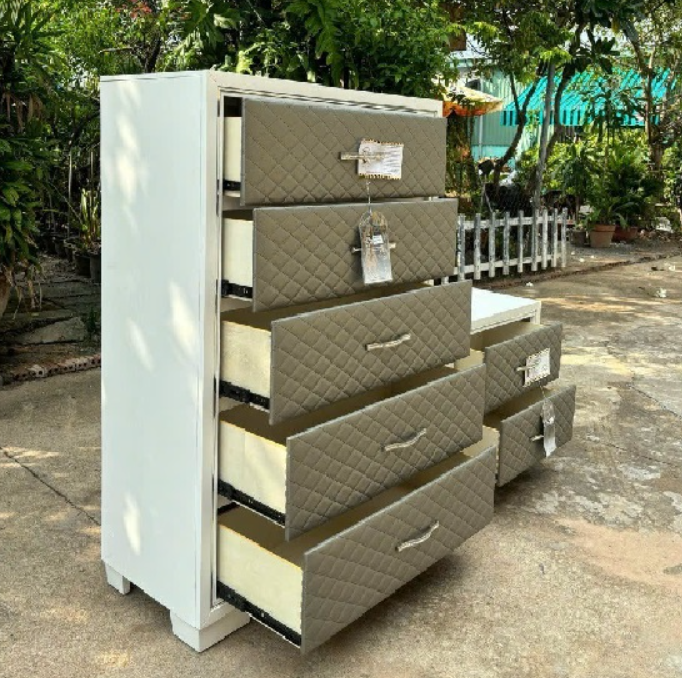 Khung Tủ màu trắng + mặt trước ngăn kéo bọc nệm màu trắng.