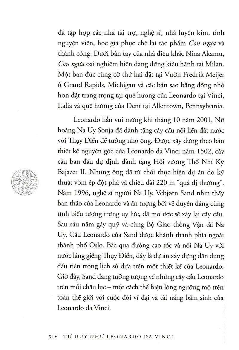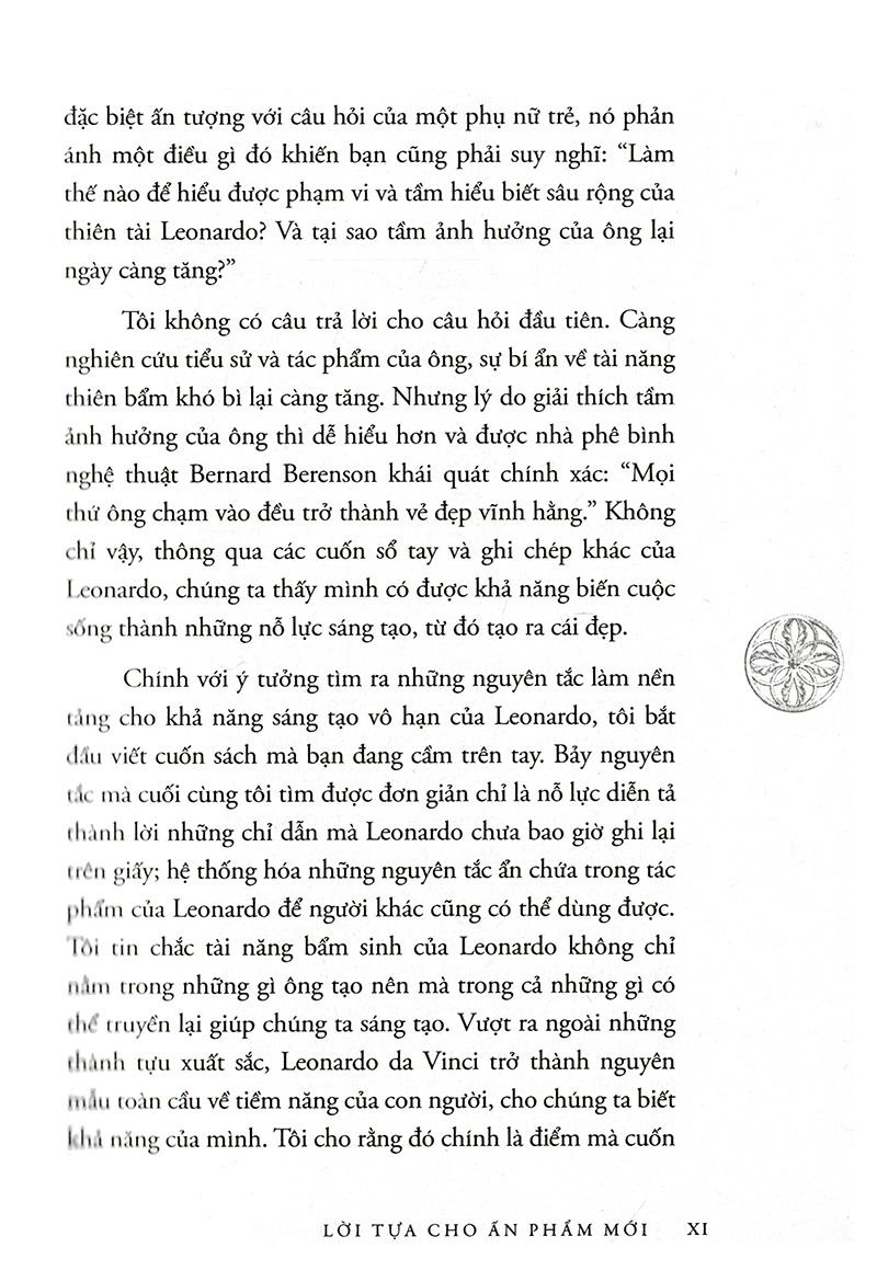 Leonardo da Vinci (1452 - 1519) là một thiên tài toàn năng người Italia: là họa sĩ, kiến trúc sư, nhà điêu khắc, nhà khảo luận mỹ thuật, thiên tài của nền văn hóa và chủ nghĩa nhân đạo thời Phục hưng, xuất chúng trong mọi hình thái nghệ thuật, hơn nữa, còn là nhạc sĩ, nhà toán học kiêm kỹ sư cơ khí, triết gia, bác sĩ, nhà giải phẫu, người đi đầu trong rất nhiều lĩnh vực phát minh khoa học sau này. Leonardo da Vinci là một thiên tài lớn. Ông có năng lực tư duy sáng tạo vô hạn. Tuy nhiên, thiên tài là do học tập chứ không phải tự nhiên mà có. Loài người đã được trao tặng nhiều tiềm năng vô hạn để học tập và sáng tạo. Bạn có thể khám phá khả năng tiềm ẩn của m.ình, mài sắc nó và giải phóng trí thông minh bằng cách thực hiện theo những cách mà thiên tài lớn nhất mọi thời đại Leonardo da Vinci đã làm.
