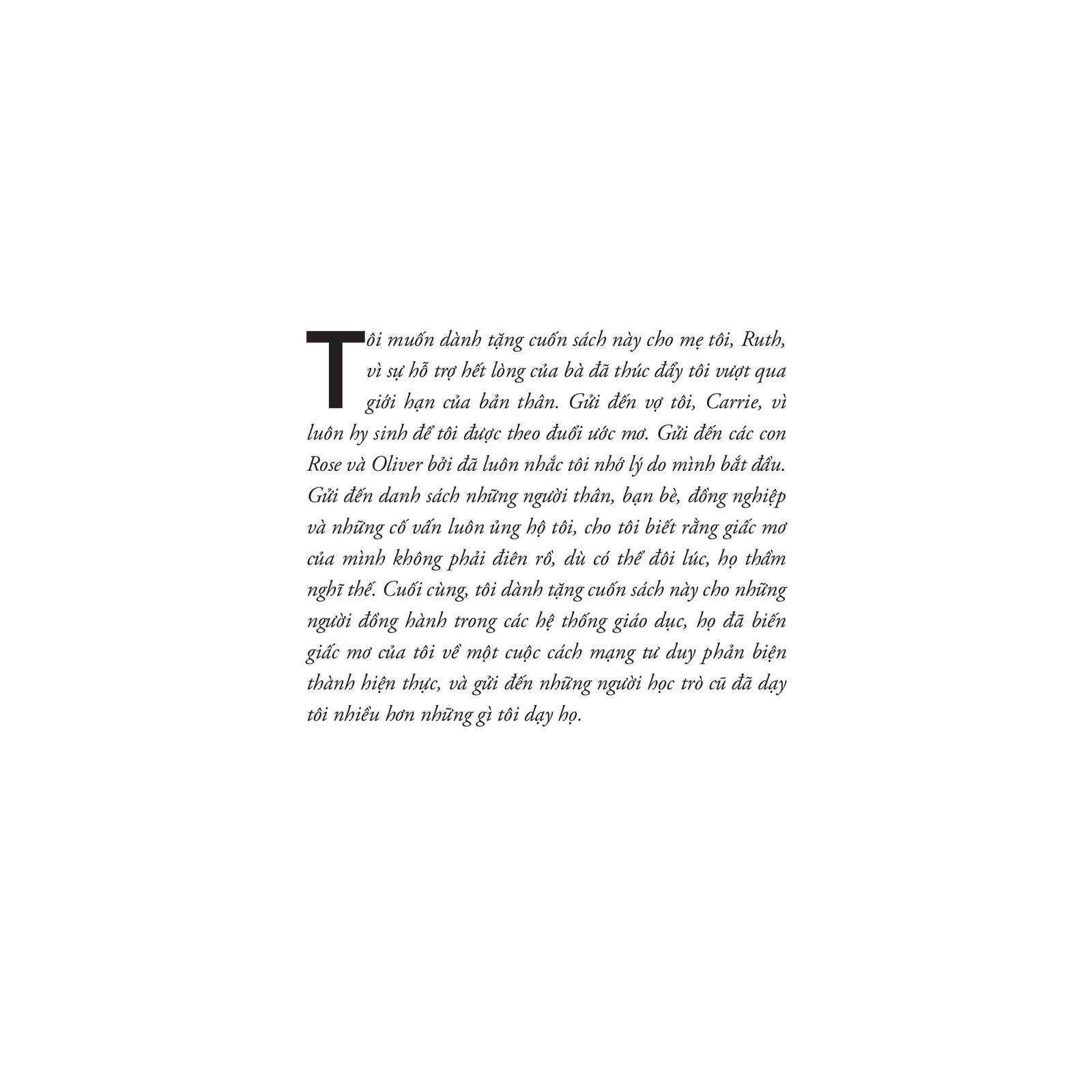 Tập trung vào việc truyền cảm hứng nhưng cũng rất thực tế về cuộc cách mạng tư duy phản biện. Lấy câu chuyện từ chính bản thân tác giả, người đã vượt qua tình trạng không phát huy được hết tiềm năng, từ đó đưa ra định nghĩa và mở rộng khái niệm về tư duy phản biện thực sự là gì (tại sao nó lại khó đến vậy), đồng thời mở rộng những ví dụ thực tế để chứng minh vì sao khoảng cách trong tư duy phản biện là vấn đề công bằng quan trọng nhất trong giáo dục nhưng ít ai bàn đến.