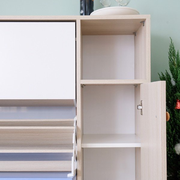 Chất liệu làm từ gỗ MFC, bề mặt phủ Melamine chống thấm, dễ dàng lau chùi Khung tủ màu nâu sẫm vân gỗ walnut kết hợp cánh tủ màu trắng hài hòa Thiết kế thông
