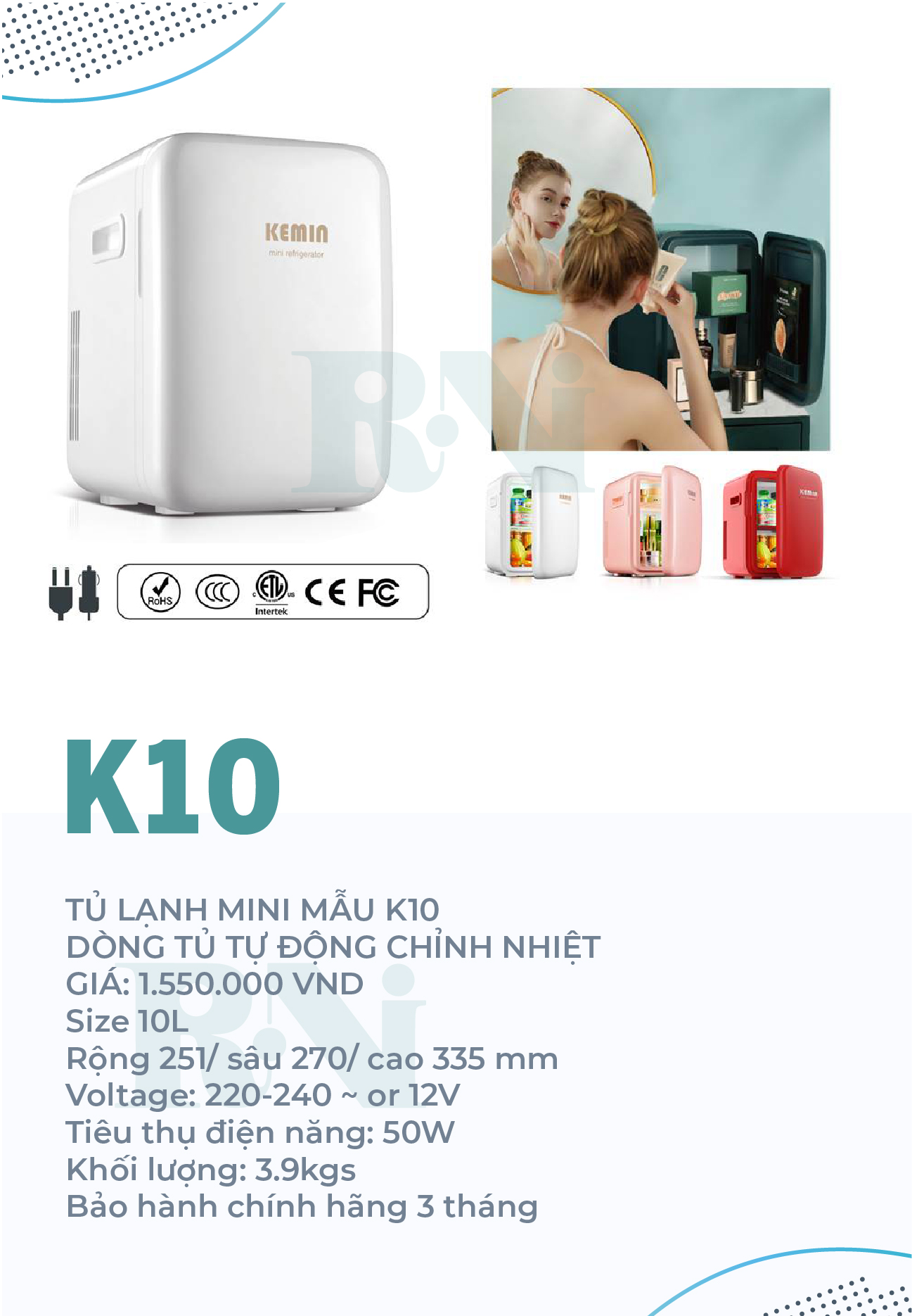 Mua tại TiktokTỦ LẠNH MINI KEMIN 10L LÀ DÒNG TỦ TỰ ĐỘNG Tủ K10 có kích thước 28x26x34cm là dòng tủ tự động, cắm điện là sử dụng Làm nóng đến 65 độ C Làm lạnh 5-15 độ C Sử dụng ở nhà (220V-50W) và trên ô tô (12V) Lưu ý: Riêng K10 mặt gương không có điện 12V, không có chế độ nóng Lưu ý: Do tủ sử dụng công nghệ làm lạnh bán dẫn nên sẽ xảy ra hiện tượng ngưng tụ hơi nước, khách hàng cần vệ sinh thường xuyên hoặc lót khăn dưới đáy tủ cho thấm hút nước TỦ LẠNH MINI KEMIN VIỆT NAM do Công ty CP Đầu tư Quốc tế RNI nhập khẩu và phân phối chính hãng tại Việt Nam Vậy tủ mini kemin phù hợp với những đối tượng nào ️