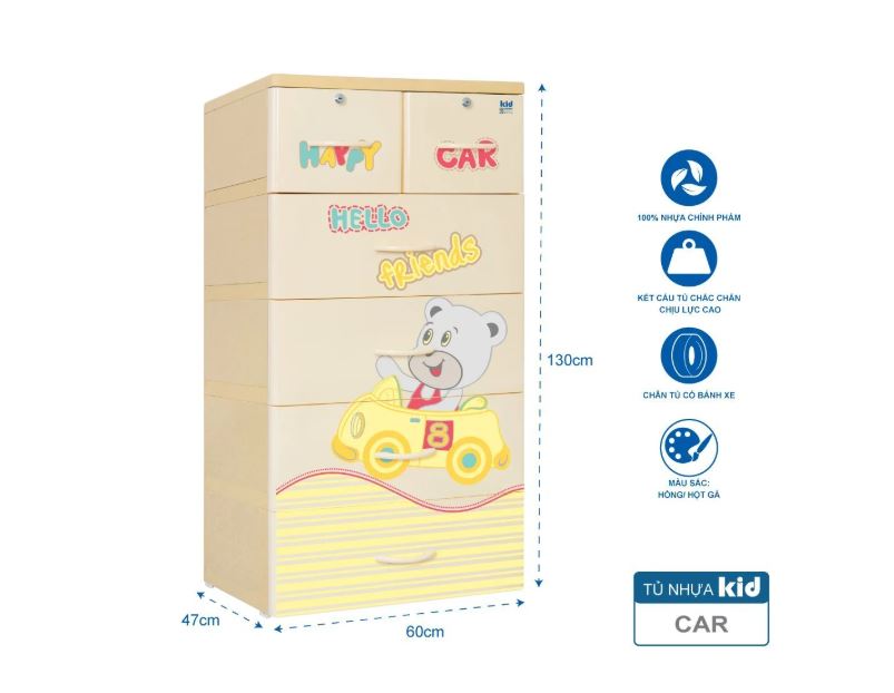 Mua tại TiktokTủ nhựa trẻ em KID 5 tầng Qui Phúc được sản xuất từ 100% nguyên liệu nhựa chính phẩm, không pha tạp chất nên không có mùi hôi nhựa và an toàn với sức khỏe người sử dụng, đặc biệt là trẻ nhỏ. Tủ có thiết kế dạng ngăn kéo, hộc tủ rộng tiện lợi để bạn phân loại và sắp xếp quần áo hay vật dụng gia đình. Chân tủ có bánh xe mini theo trục ngang, giúp dễ dàng di chuyển tủ từ nơi này sang nơi khác. Màu sắc tủ đa dạng, nhã nhặn, họa tiết tủ ngộ nghĩnh, đáng yêu phù hợp với lứa tuổi của trẻ em. Chất liệu: 100% nhựa PP và nhựa ABS chính phẩm Kích thước: