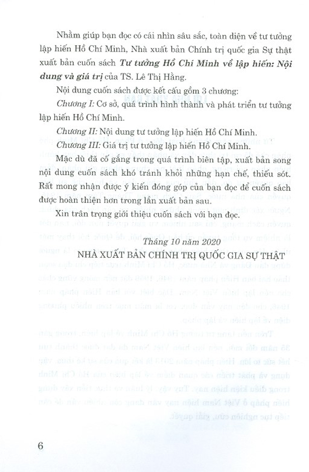 Cuốn sách còn giúp bạn đọc có cái nhìn sâu sắc, toàn diện về tư tưởng lập hiến Hồ Chí Minh. Hiến pháp 2013 là kết quả của sự kế thừa, vận dụng và phát triển các quan điểm về lập hiến của Hồ Chí Minh trong điều kiện hiện nay.
