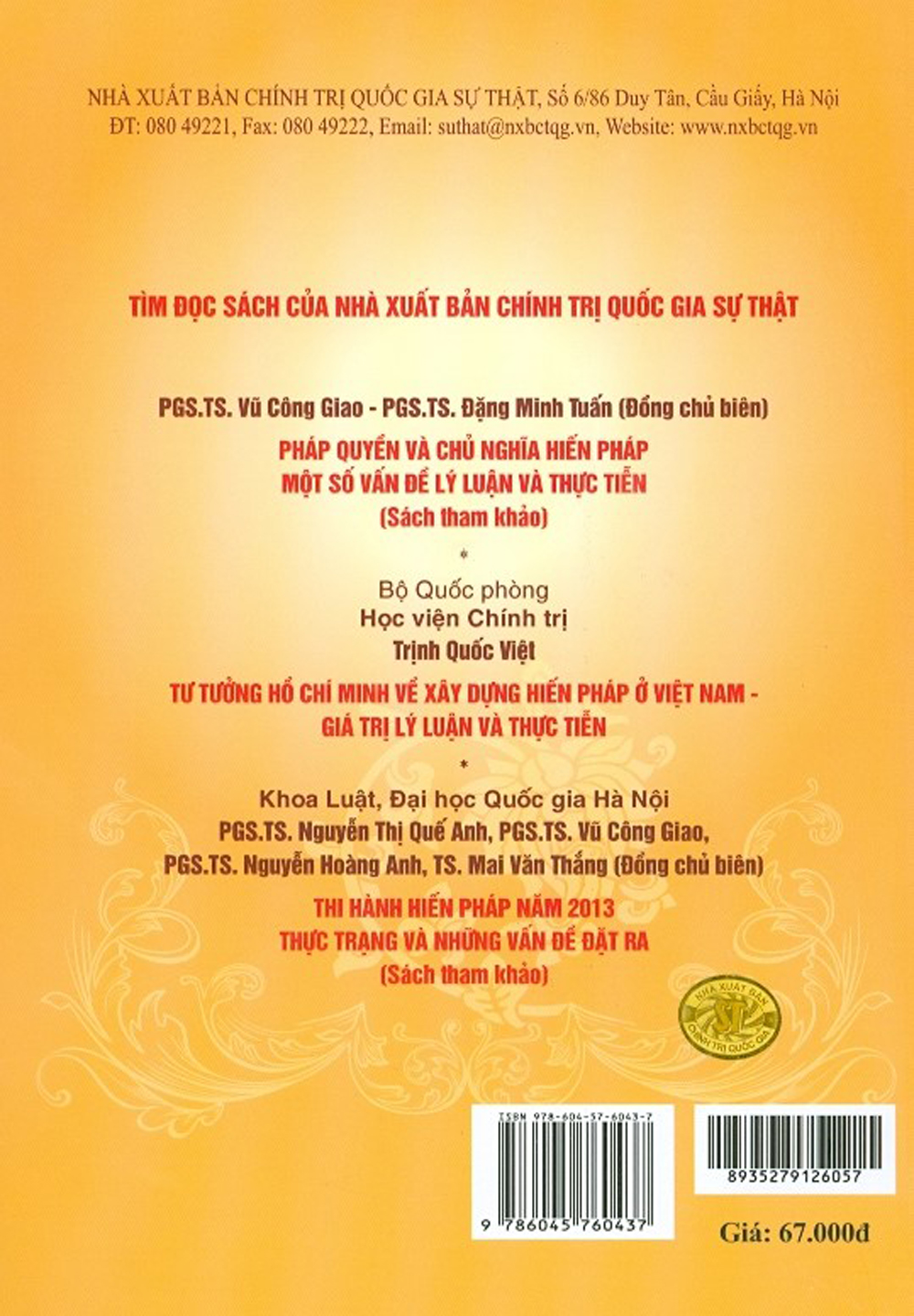 Mua tại TiktokTrên nền tảng tư tưởng Hồ Chí Minh về lập hiến, trong gần 35 năm đổi mới, nền lập hiến Việt Nam đã đạt được thành tựu hết sức to lớn. Hiến pháp năm 2013 là kết quả của sự kế thừa, vận dụng và phát triển các quan điểm về lập hiến của Hồ Chí Minh trong điều kiện hiện nay. Tuy vậy, lý luận và thực tiễn xây dựng hiến pháp ở Việt Nam hiện nay đang còn nhiều vấn đề cần tiếp tục nghiên cứu, giải quyết.