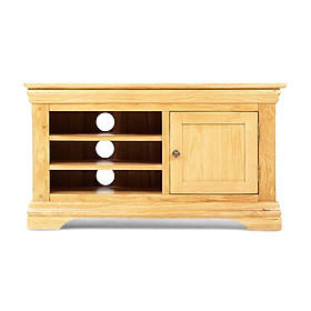 Là sự kết hợp hoàn hảo giữa sức quyến rũ vượt thời gian với tính thực dụng hiện đại, mẫu tủ TV gợi nhớ đến phong cách cổ điển Pháp thế kỷ 19. Thuộc bộ sưu tập Victoria đặc trưng bởi mái vòm và những đường cong quyến rũ, thêm kiểu thiết kế 1 cánh lệch duyên dáng. Chính vì thế, nếu không có chương trình gì hay trên TV thì chiếc tủ này cũng giúp bạn có thứ để ngắm nghía, chiêm ngưỡng. Một hộc lớn với kệ di động để cất giữ đồ dùng không muốn trưng bày, còn bề mặt và các ngăn chính giữa sẽ giúp bạn để các thiết bị âm thanh giải trí hay những đồ trang trí khác. Chất liệu gỗ sồi trắng Mỹ nhập khẩu, có giá trị kinh tế cao và được chế tác hoàn toàn thủ công bởi những người thợ lành nghề. Toàn bộ bề mặt được sơn phủ PU kỹ càng, giữ nguyên được vẻ đẹp của vân gỗ, đồng thời bảo vệ lớp gỗ lâu bền trong các điều kiện khí hậu khác nhau