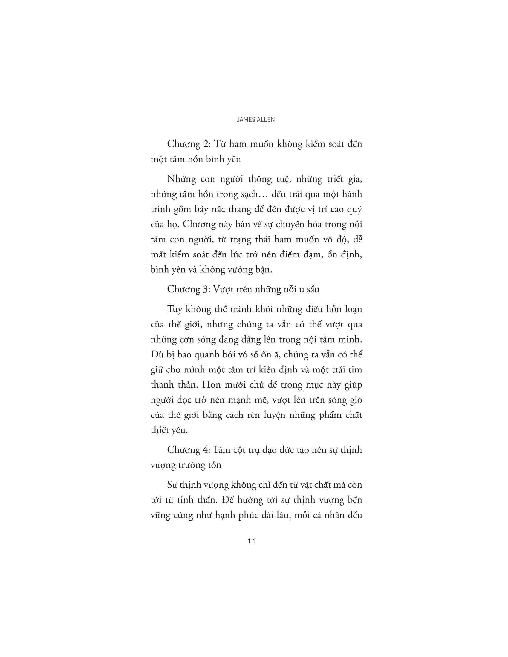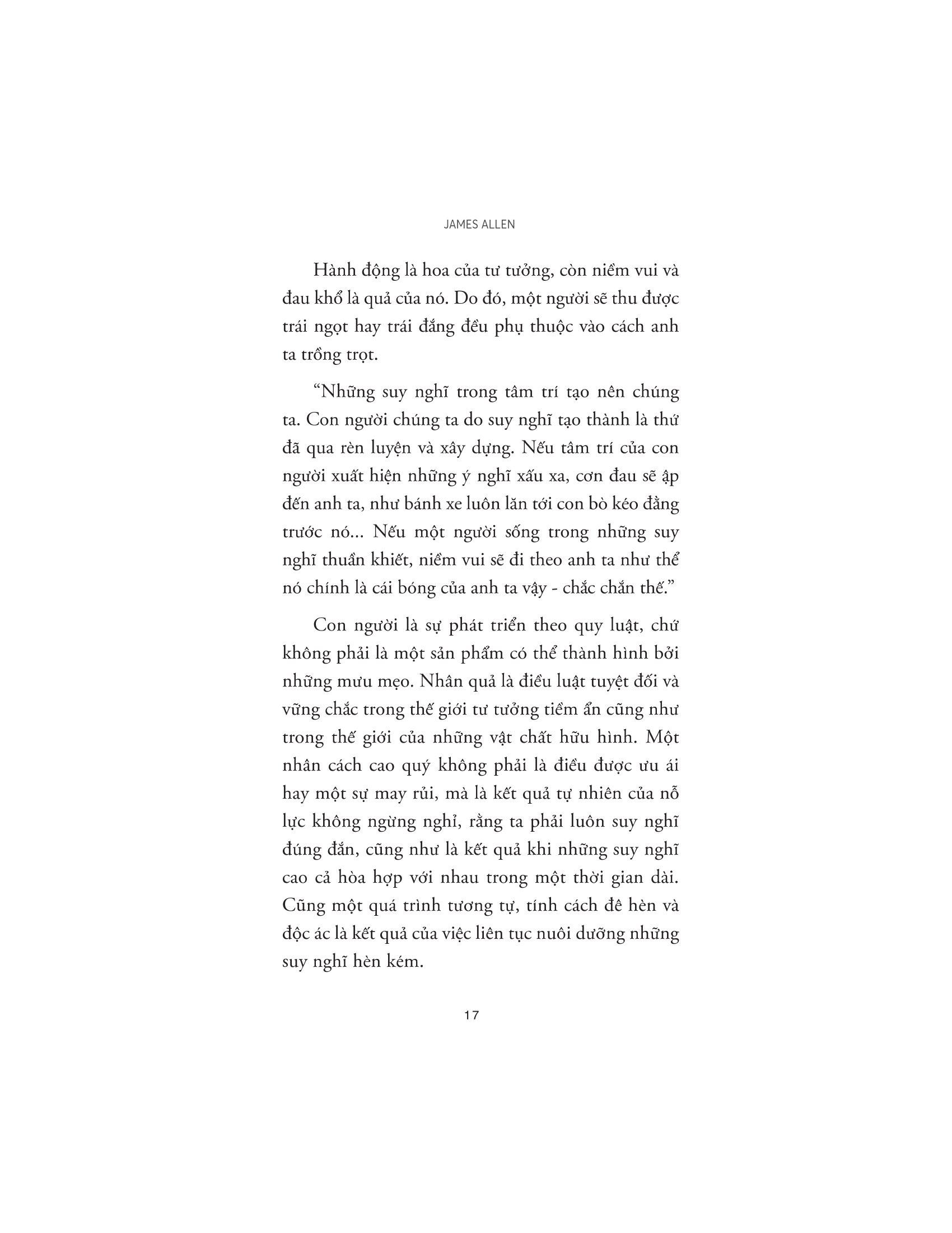 Từ Vô Minh Đến Tỉnh Thức “Mỗi hạt giống suy nghĩ được gieo vào tâm trí và bén rễ ở đó sẽ tự sinh trưởng và nở hoa thành hành động, rồi tạo nên những cơ hội và hoàn cảnh cụ thể. Ý nghĩ tốt lành đậu quả ngọt thơm, ý nghĩa xấu xa đậu quả mục rỗng”. As a man thinketh – Từ vô minh đến tỉnh thức là tuyển tập những tác phẩm nổi tiếng nhất của triết gia thiên tài người Anh – James Allen. Cuốn sách này là những dòng suy ngẫm của tác giả về bản chất con người, với tư cách là một cá thể độc lập cũng như một thành viên của xã hội. Thế giới bên ngoài, rực rỡ, đẹp đẽ hay tăm tối xấu xa, hoàn toàn phụ thuộc vào cách ta nuôi dưỡng thế giới nội tâm của m.ình. Trong hành trình vun xới cho khu vườn tâm trí ấy, liệu ta có biếng lười mà thả m.ình theo những cám dỗ ngọt ngào hiểm ác, hay sẽ can đảm lựa chọn một con đường dẫu gian lao nhưng lương thiện, trong sáng và được ban phước lành? Về tác giả: James Allen (1864 – 1912) là một người bí ẩn trong giới sách vở, nhưng những bài viết đầy cảm hứng của ông đã tác động đến hàng triệu người. Những chiêm nghiệm sâu sắc của ông về nội tâm con người - cụ thể là cách con người suy nghĩ, cảm nhận và tu dưỡng đạo đức - vẫn còn nguyên giá trị và thường xuyên được trích dẫn lại, ngay cả khi những cuốn sách ông viết đã được xuất bản cách đây hơn một trăm năm, trong những năm đầu tiên của thế kỷ 20. James Allen hướng tới sống một cuộc đời lý tưởng theo miêu tả của tiểu thuyết gia vĩ đại người Nga Lev Tolstoy, một cuộc sống tự nguyện nghèo khó, đề cao lao động chân tay và gìn giữ kỷ luật một cách khổ hạnh. Giống như Tolstoy, Allen tìm cách cải thiện bản thân m.ình, biết hạnh phúc và trở thành một con người toàn diện về đạo đức. Những tác phẩm của Allen một mặt thể hiện ảnh hưởng của chủ nghĩa Tin lành tự do và mặt khác thể hiện tư tưởng Phật giáo. Allen tập trung vào sức mạnh của mỗi cá nhân trong việc hình thành tính cách và tạo ra hạnh phúc cho chính m.ình. Ông nói, tư duy và tính cách là một, và vì tính cách chỉ có thể tự bộc lộ thông qua môi trường và hoàn cảnh, nên các điều kiện bên ngoài của cuộc sống một người sẽ luôn liên quan một cách hài hòa với nội tâm của họ. Những lời khen tặng “Đến ngày hôm nay, tác phẩm của James Allen về sức mạnh của tâm trí vẫn giá trị như khi nó được viết ra một thế kỷ trước.” “As a Man Thinketh là một cuốn sách cách mạng giúp mang tới nhận thức về sức mạnh của tiềm thức, thành tựu và những suy nghĩ tích cực” “As a Man Thinketh là một cuốn sách ngắn nhưng có khả năng và sẽ thay đổi cuộc đời bạn.”