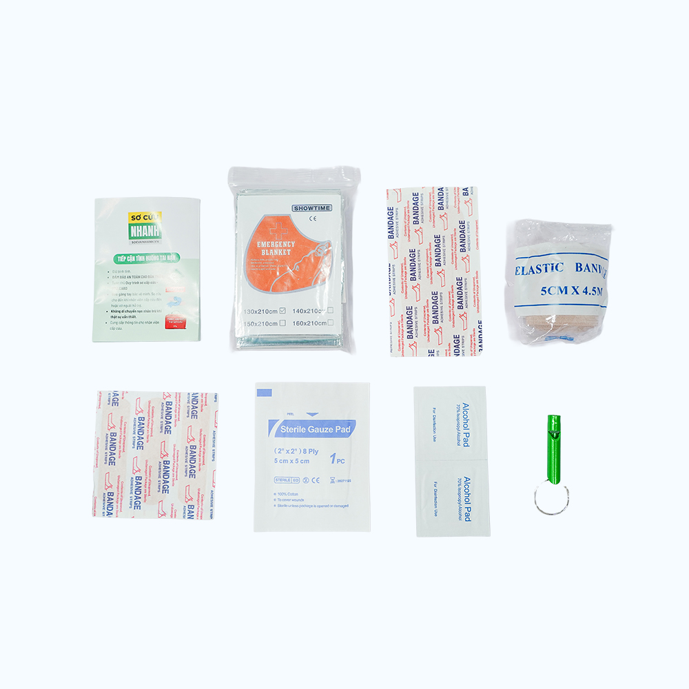 Thành phần Túi sơ cứu bao gồm các dụng cụ sau: - Dụng cụ bảo vệ: + Băng cá nhân chuẩn, Băng cá nhân lớn, Băng cá nhân hoạt hình, Băng đầu ngón tay +
