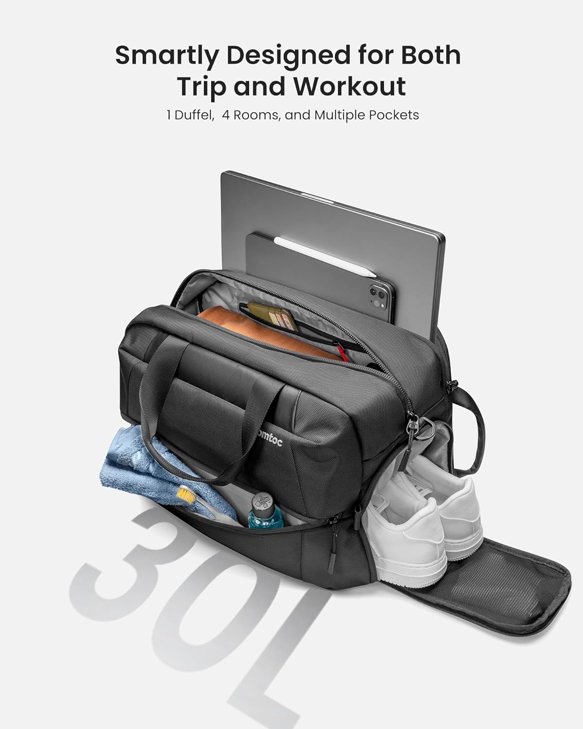 Đối với những chuyến tập gym, bạn có thể sử dụng ngăn trước bằng polyester 210D bền và chống nước để đựng quần áo tập gym, thậm chí cả khăn ướt. Ngăn đựng giày thông thoáng có thể chứa giày nam cỡ 11.