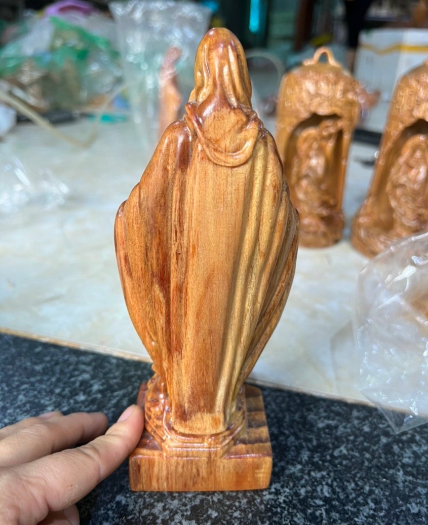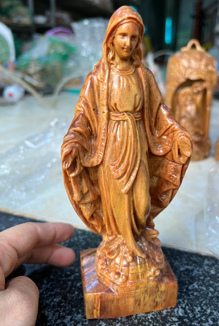 Mua tại TiktokTượng đức mẹ ban ơn được làm bằng chất liệu gỗ huyết long liền khối tự nhiên 100% Kt cao 20×8×6cm _ Tượng đức mẹ ban ơn được điêu khắc trạm trổ vô cùng tỉ mỉ , tinh sảo kỳ công .Đi hầu hết tất cả mọi chi tiết góc ngách nội dung hoa văn của tượng đều được gọt tỉa chỉnh sửa hoàn toàn bằng tay thủ công .Tượng được làm và hoàn thiện ,do bàn tay khối óc tài hoa ,Từ những người thợ dầy rặn kinh nghiệm ,cũng như tay nghề cao trong làng nghề truyền thống .Chính vì thế tượng đức mẹ ban ơn đã đáp ứng đầy đủ mọi tiêu tiêu cần thiết như ( Đẹp bền rẻ ) Thẩm mỹ nghệ thuật với chất lượng tuyệt vời