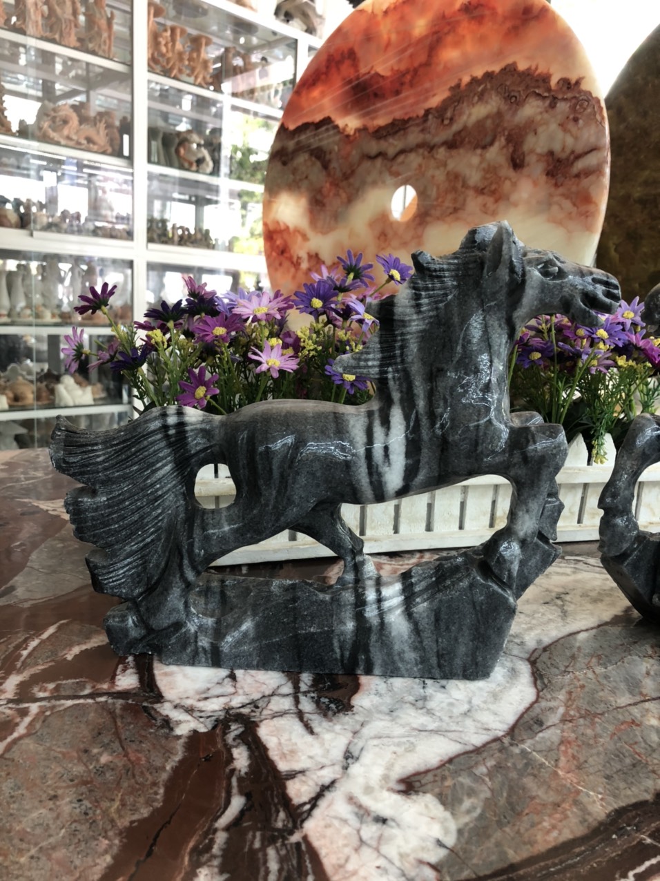 Chất liệu: Đá cẩm thạch vân đen Kích thước: Dài 25 cm x Rộng 6 cm x Cao 23 cm Khối lượng: 6,5 kg Ngựa được nhiều doanh nhân ưa chuộng. Bởi lẽ, trong phong