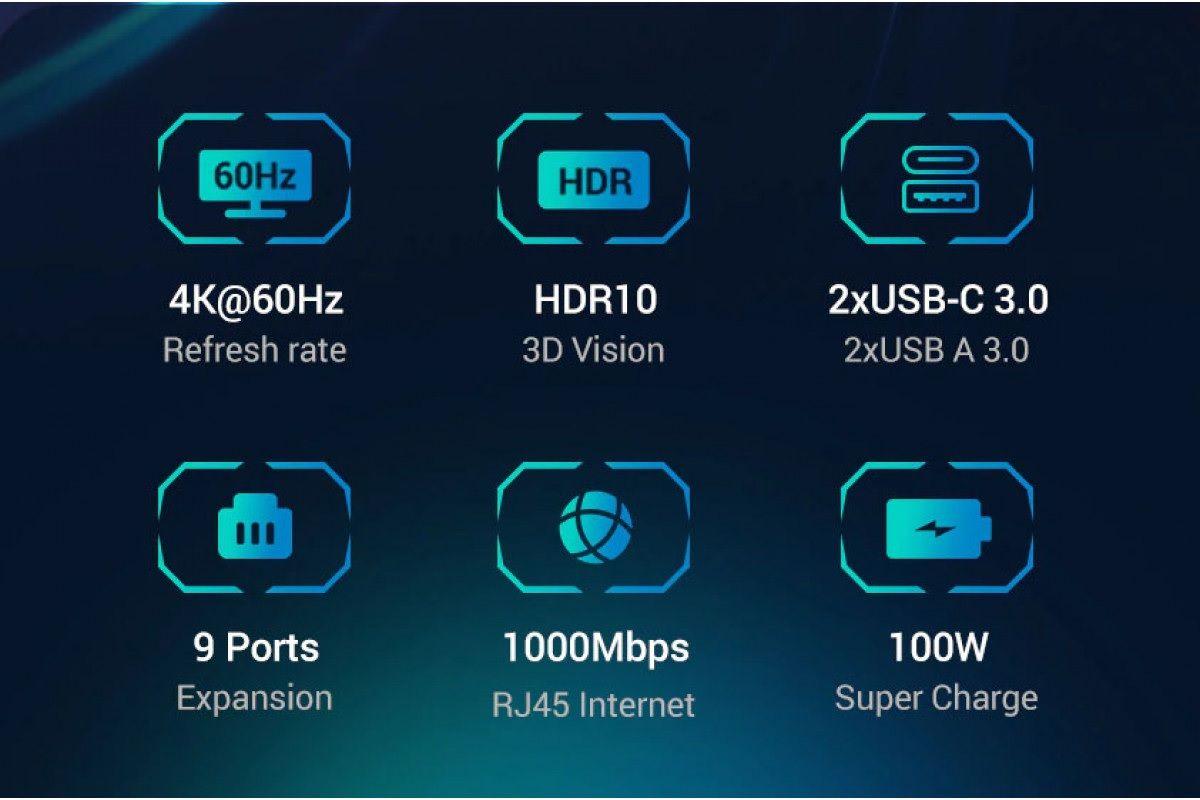 1. Đầu vào: USB Loại C 2. Đầu ra: 1*USB-A 3.0Female, 2*USB-A3.2, 1*USB-C 3.2,2*HDMI, 1*RJ45 Gigabit, 1*TF slot, 1*SD slot, 3.5mm, PD 3. HDMI 1 (màn hình ngoài đơn): Lên đến 4K@60Hz 4. HDMI 2