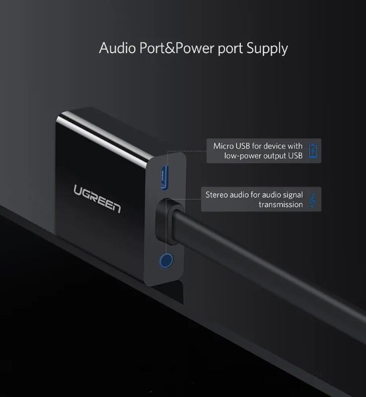 Ugreen 40248 Hdmi To Vga + 3.5Mm Audio + Mirco Usb Converter Flat Design Đen Mm103 1. Features: connect HDMI port device to monitor, projector with VGA port. 2. Cable length: 15CM 3. Wire form: