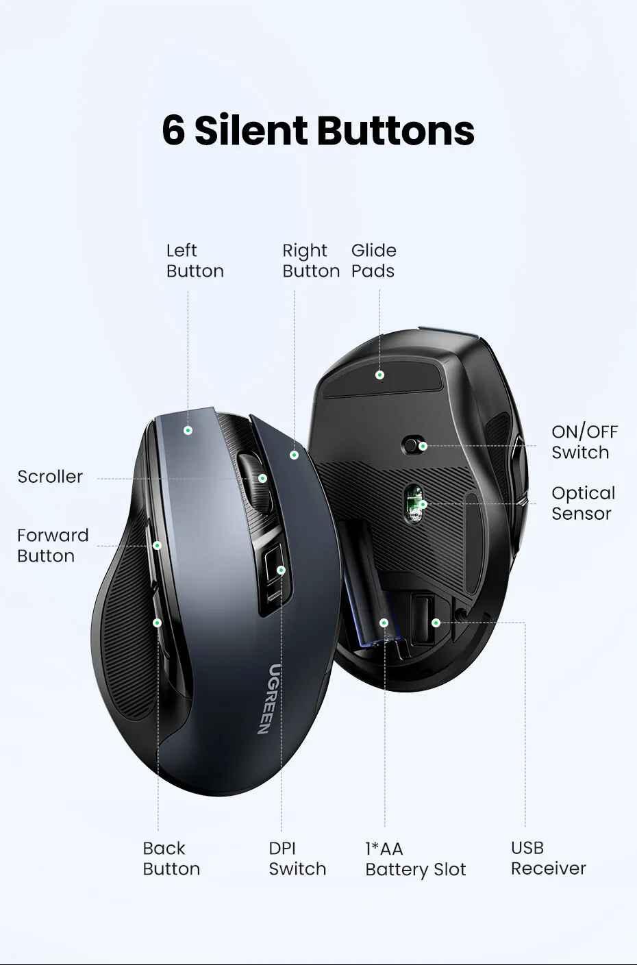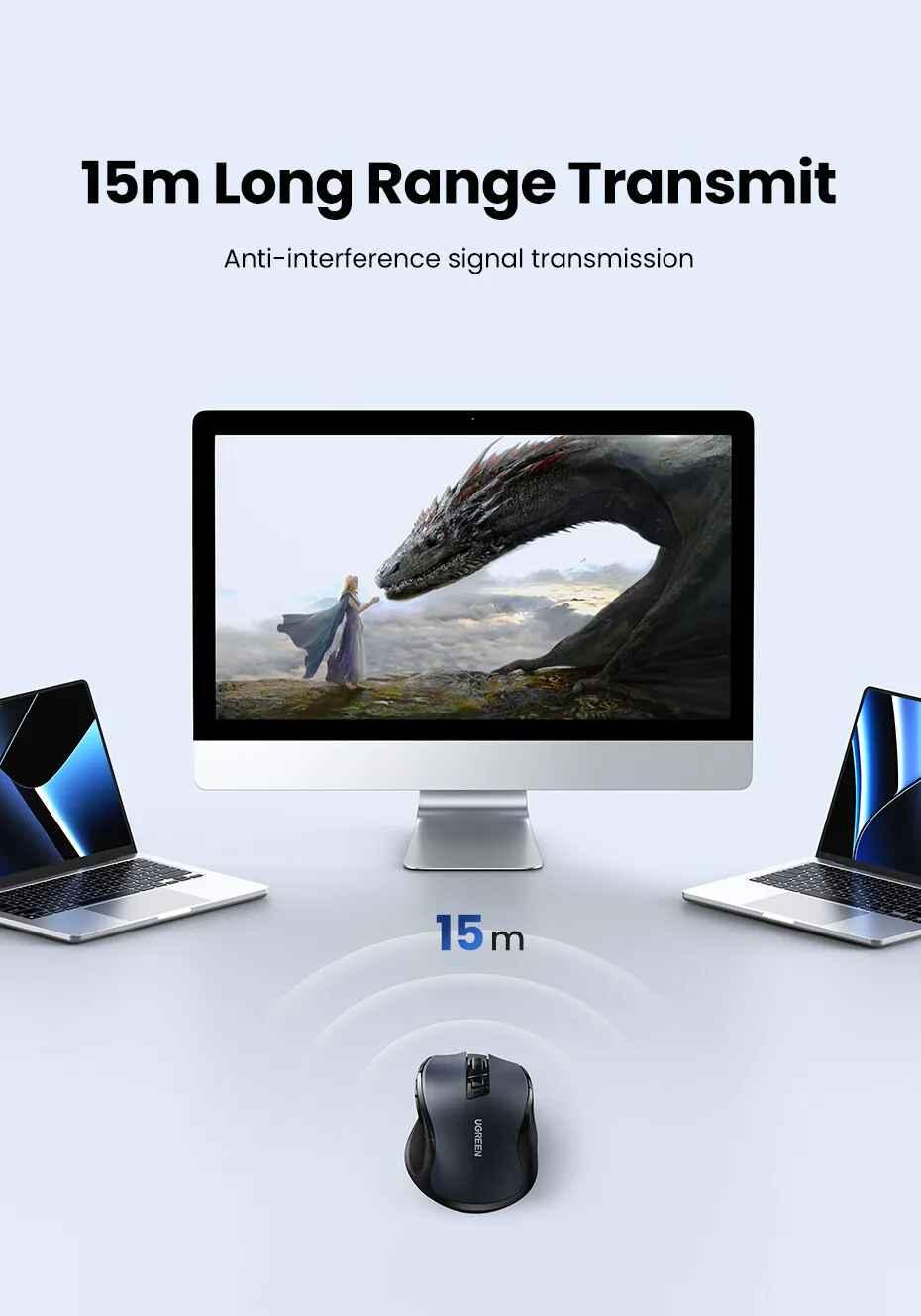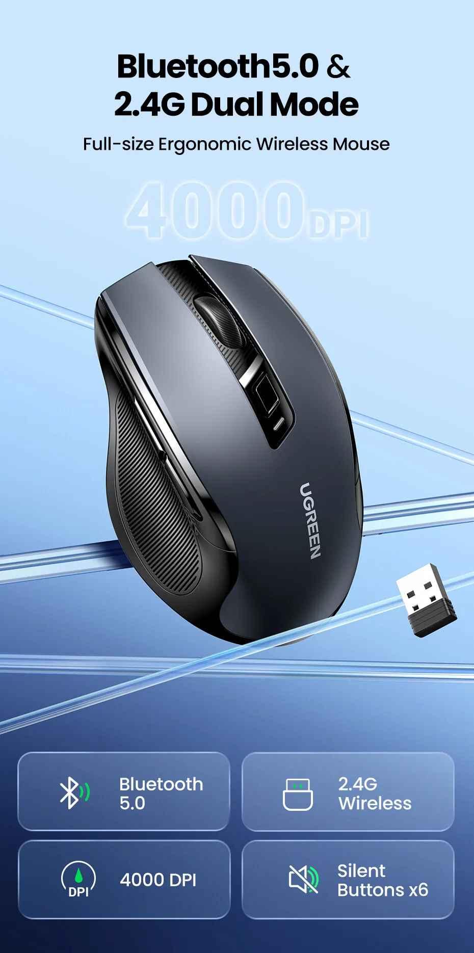 1. Brand: Ugreen 2. Product name: Wireless mouse + Bluetooth 3. Model: 90855 - MU006 4. Color : Black 5. Connection method: 2.4G wireless (USB receiver) + Bluetooth 5.0 6. Working distance: 15 meters 7.