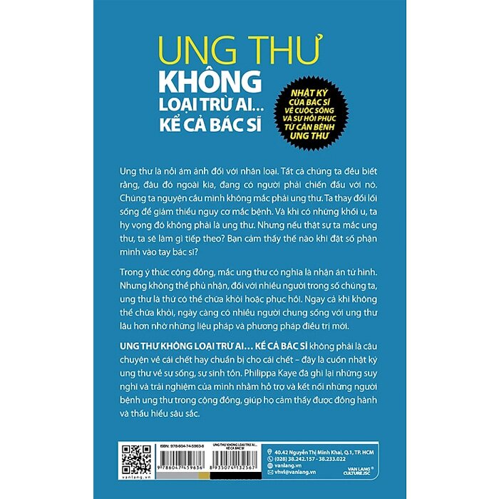 UNG THƯ KHÔNG LOẠI TRỪ AI… KỂ CẢ BÁC SĨ không phải là câu chuyện về cái chết hay chuẩn bị cho cái chết - đây là cuốn nhật ký ung thư về sự sống, sự sinh tồn. Philippa Kaye đã ghi lại những suy nghĩ và trải nghiệm của mình nhằm hỗ trợ và kết nối những người bệnh ung thư trong cộng đồng, giúp họ cảm thấy được đồng hành và thấu hiểu sâu sắc.