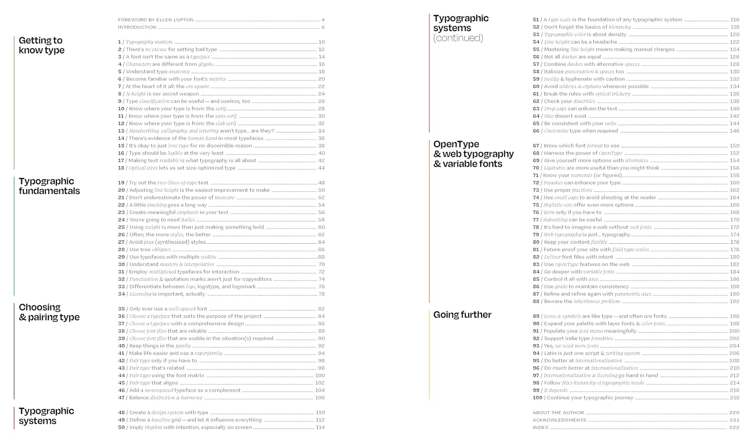 Richly illustrated and easy to navigate, Universal Principles of Typographypairs clear explanations of each principle with visual examples of it applied in practice. By considering these concepts and examples, you can learn to make more informed, and ultimately better, typography decisions.