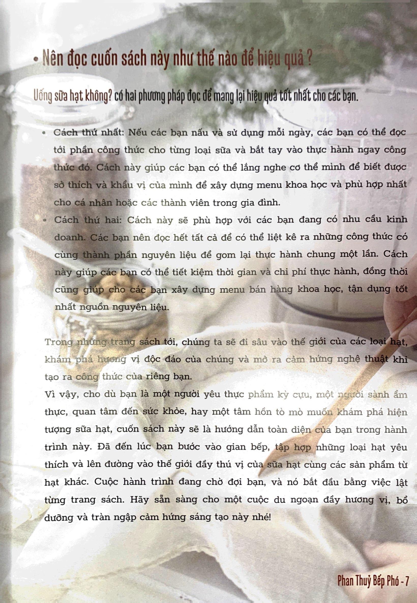 Vì vậy, cho dù bạn là một người yêu thực phẩm kỳ cựu, một người sành ẩm thực, quan tâm đến sức khỏe, hay một tâm hồn tò mò muốn khám phá hiện tượng sữa hạt, cuốn sách này sẽ là hướng dẫn toàn diện của bạn trong hành trình này. Đã đến lúc bạn bước vào gian bếp, tập hợp những loại hạt yêu thích và lên đường vào thế giới đầy thú vị của sữa hạt cùng các sản phẩm từ hạt khác. Cuộc hành trình đang chờ đợi bạn, và nó bắt đầu bằng việc lật từng trang sách. Hãy sẵn sàng cho một cuộc du ngoạn đầy hương vị, bổ dưỡng và tràn ngập cảm hứng sáng tạo này nhé!
