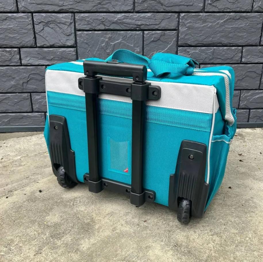 -Tay kéo rút gập và bánh xe đẩy. Có 5 túi bên ngoài và nhiều túi bên trong. Khung cứng để dễ dàng mở và sử dụng