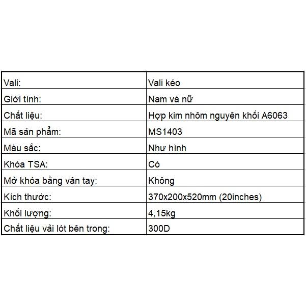 ✨Vali hợp kim nhôm nguyên khối MS1403 Macsim cao cấp màu xanh Green, xanh Blue, màu đen,màu bạc (20 inches)
