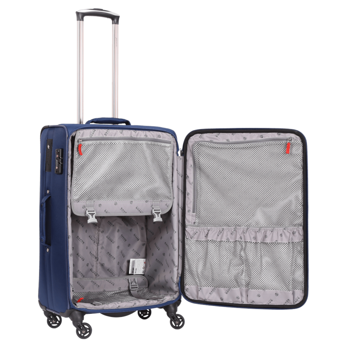 1. Khả năng nới rộng: 5 cm 2. Phía dưới vali có tay cầm đúc, quai xách ngang, khóa TSA theo tiêu chuẩn Hoa Kỳ 3. Bánh xe đôi xoay 360 độ 4. Phía trong