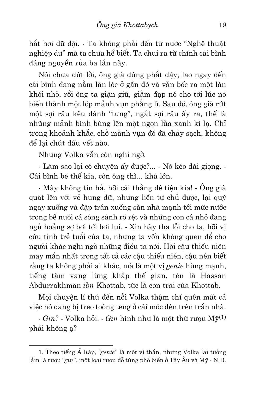Đầu tiên, ông Khottabych suýt làm Volka thi trượt khi nhắc bài cho cậu bằng những kiến thức địa lí từ thời cổ đại. Sau đó, để cậu vui lên, ông biến ra hàng loạt món quà: tòa lâu đài tráng lệ trên sân chơi, hàng đoàn lạc đà xuất hiện giữa phố, 22 quả bóng da dê thượng hạng để 22 cầu thủ khỏi phải tranh nhau trên sân… Cứ như thế, cuộc sống của Volka bị đảo lộn mỗi khi ông Khottabych rứt một sợi râu để làm phép, vì ông hoàn toàn ngây thơ trong xã hội hiện đại.