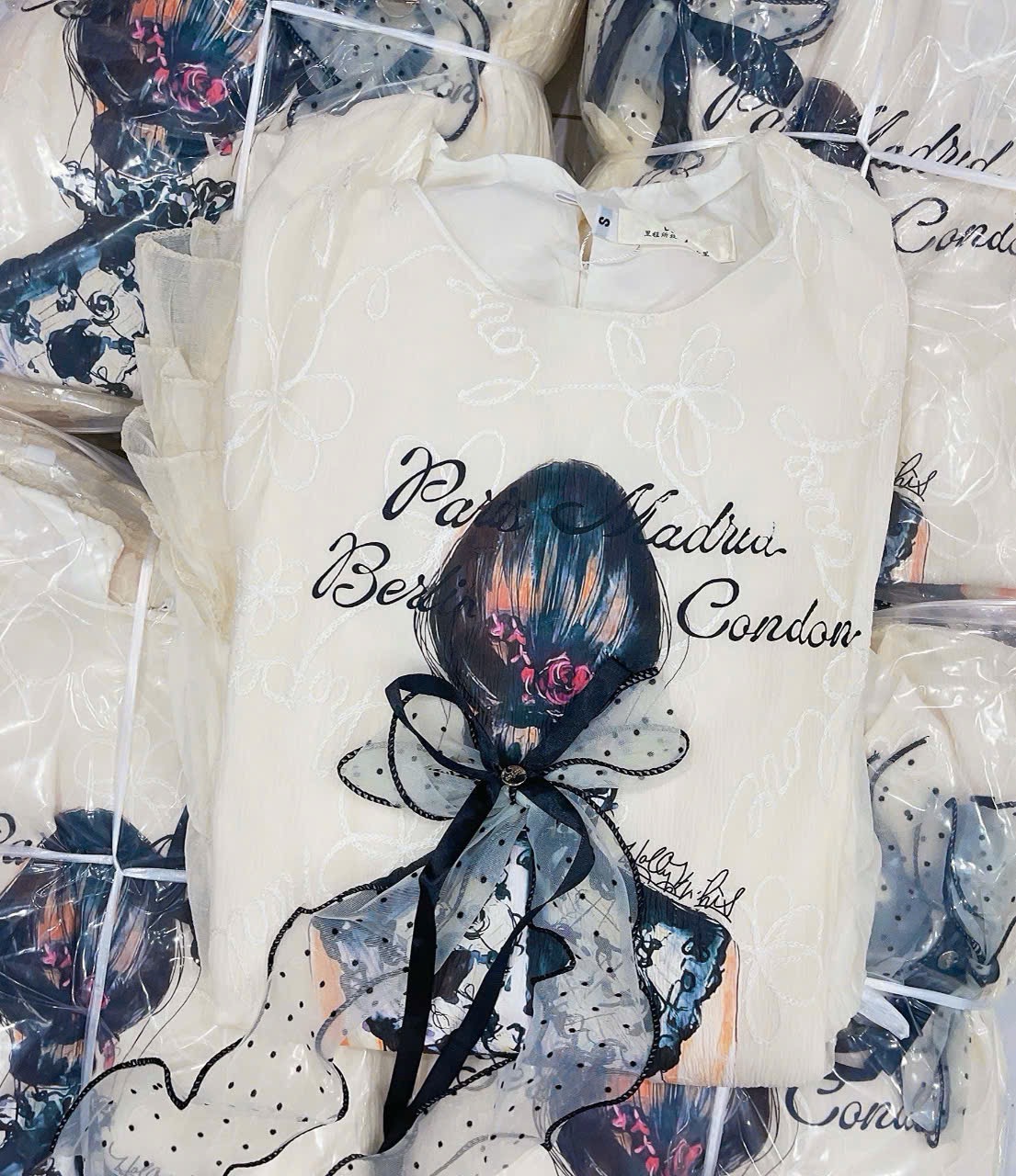 ✨Váy Ren Tơ 2 Lớp In Cô Gái Phối Chân Thô Bèo Tầng Kèm Tag Nơ