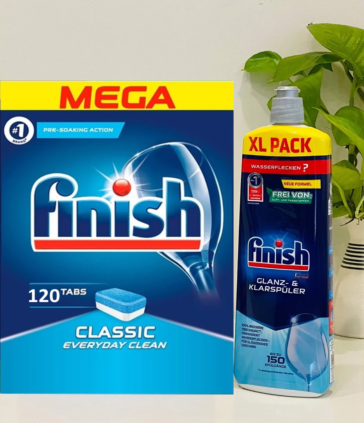 Combo: Viên rửa Finish 120 viên + Nước làm bóng Finish 800ml Chuyên dùng cho máy rửa bát chén Giúp bát đĩa nhà bạn sạch hơn, nhanh khô hơn và bóng sáng hơn