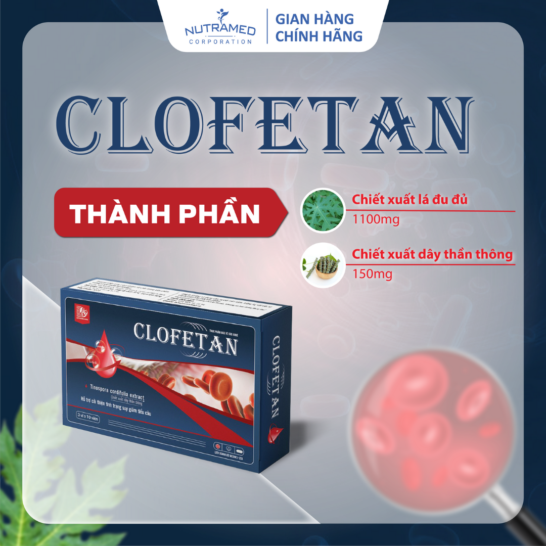 CLOFETAN - Giải pháp hỗ trợ hạn chế nguy cơ giảm tiểu cầu THÀNH PHẦN ️ Chiết xuất lá Đu đủ (Carica papaya leaf extract); Chiết xuất Dây thần thông (Tinospora cordifolia extract)