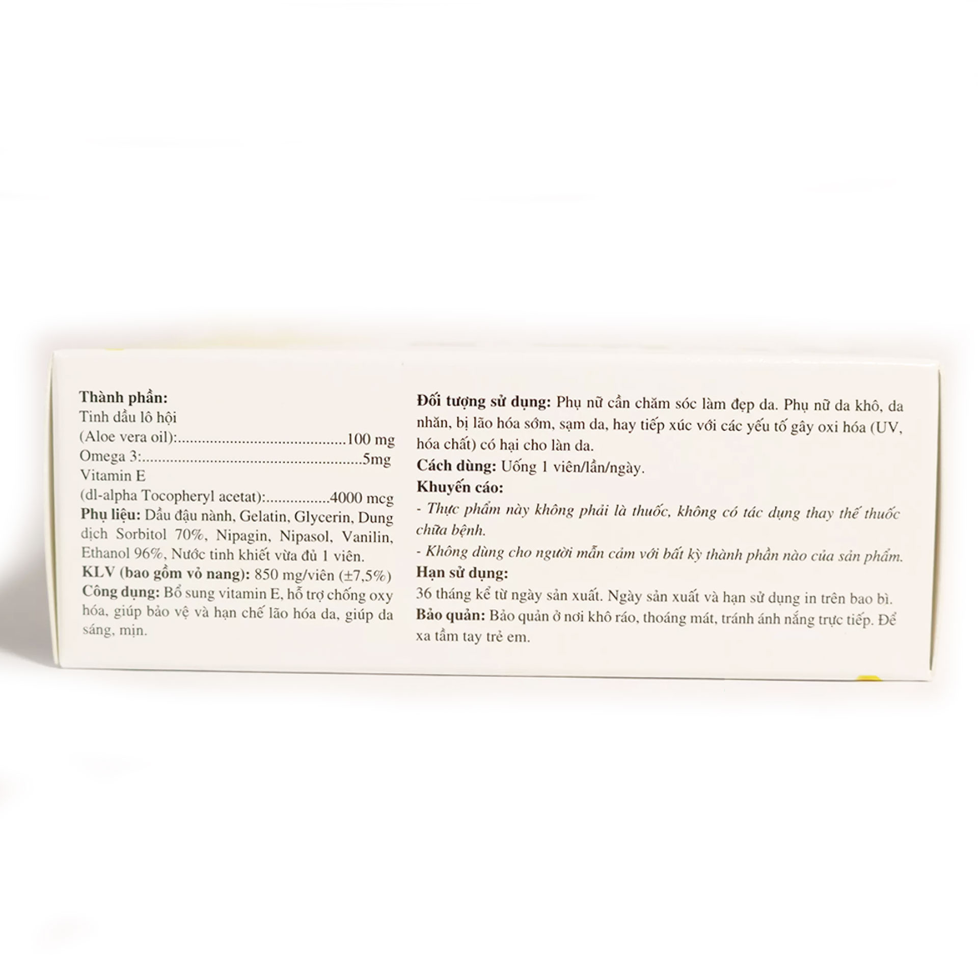 THÀNH PHẦN VITAMIN E ROSTEX Vitamin E : 4000mcg Omega 3: 5mg Tinh dầu Lô hội : 10mg Phụ liệu: Dầu đậu nành, Gelatin, Glycerin, Dung dịch Sorbitol 70%, Vanilin, Nipagin, Napisol, Ethanol 96%, Nước tinh khiết vừa đủ 1 viên. CÔNG DỤNG CỦA VIVITA E ROSTEX Vitamin E Rostex làm đẹp da, chống lão hóa, giảm thâm nám Vitamin E giúp da sáng mượt, hạn chế các vết nhăn, vết nám Vitamin E giúp dưỡng ẩm cho da, căng mịn da, sáng mịn da Chống oxy hóa da Viên uống đẹp da Vitamin E Vivita E Rostex Hộp 30 viên ĐỐI TƯỢNG NÊN DÙNG Người bị tổn thương da ( da khô, nám da, sạm da,tàn nhang, nhăn nha) Người có dấu hiệu lão hóa da Người thường xuyên tiếp xúc với các yếu tố gây oxy hóa (tia UV, hóa chất) có hại cho da Người có nhu cầu làm đẹp da từ bên trong HƯỚNG DẪN SỬ DỤNG Ngày uống 1 lần, mỗi lần 1 viên Nên uống buổi tối trước khi đi ngủ Sản phẩm này không phải là thuốc và không có tác dụng thay thế thuốc ch.ữa bệnh Không dành cho người có mẫn cảm với bất kỳ thành phần nào của sản phẩm
