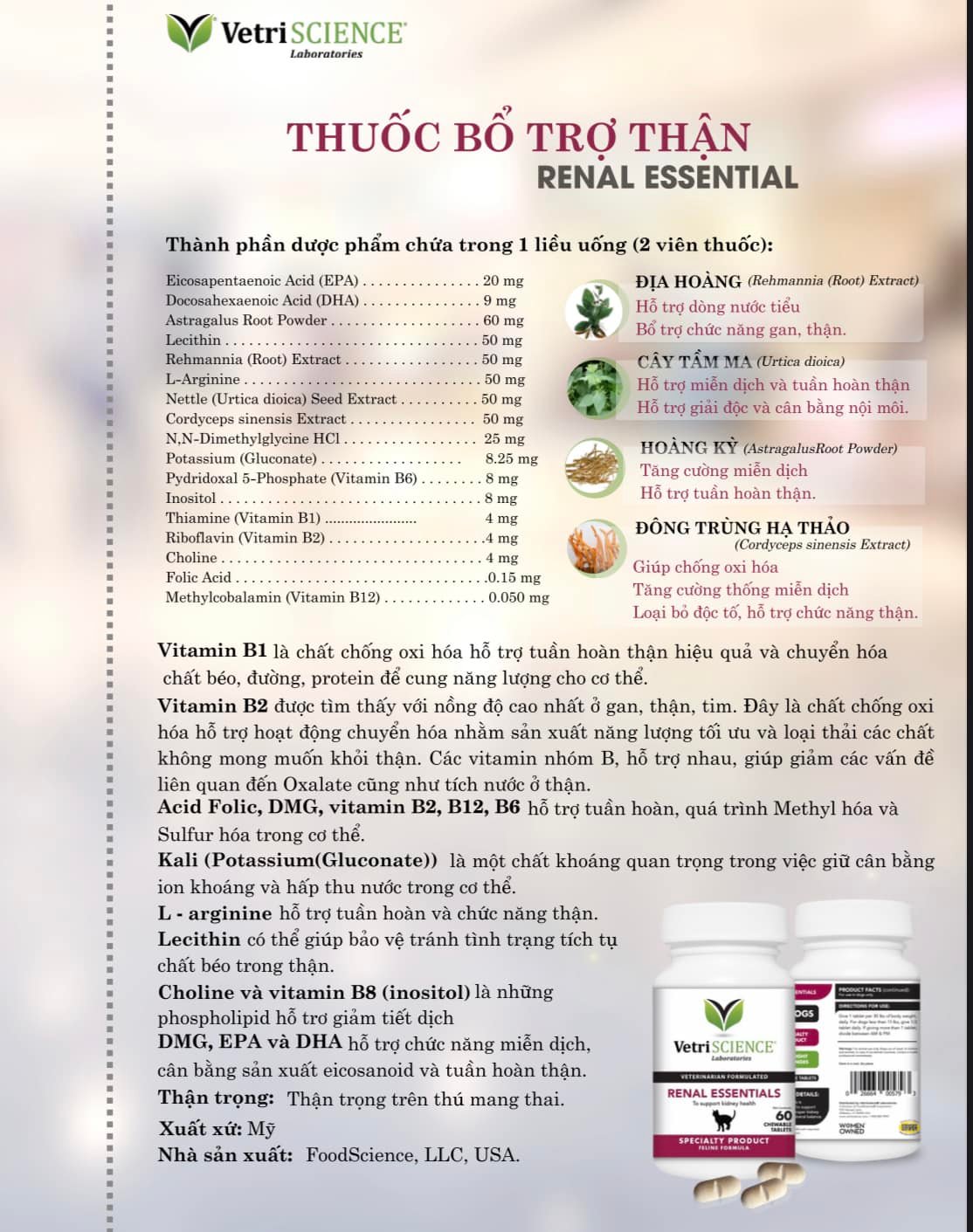 Sản phẩm được dùng trong các trường hợp: Tăng cường chức năng thận. Hỗ trợ cải thiện tuần hoàn máu đến thận. Duy trì chức năng tế bào. Chó và mèo cần tăng cường sức khỏe và chức năng thận. C...