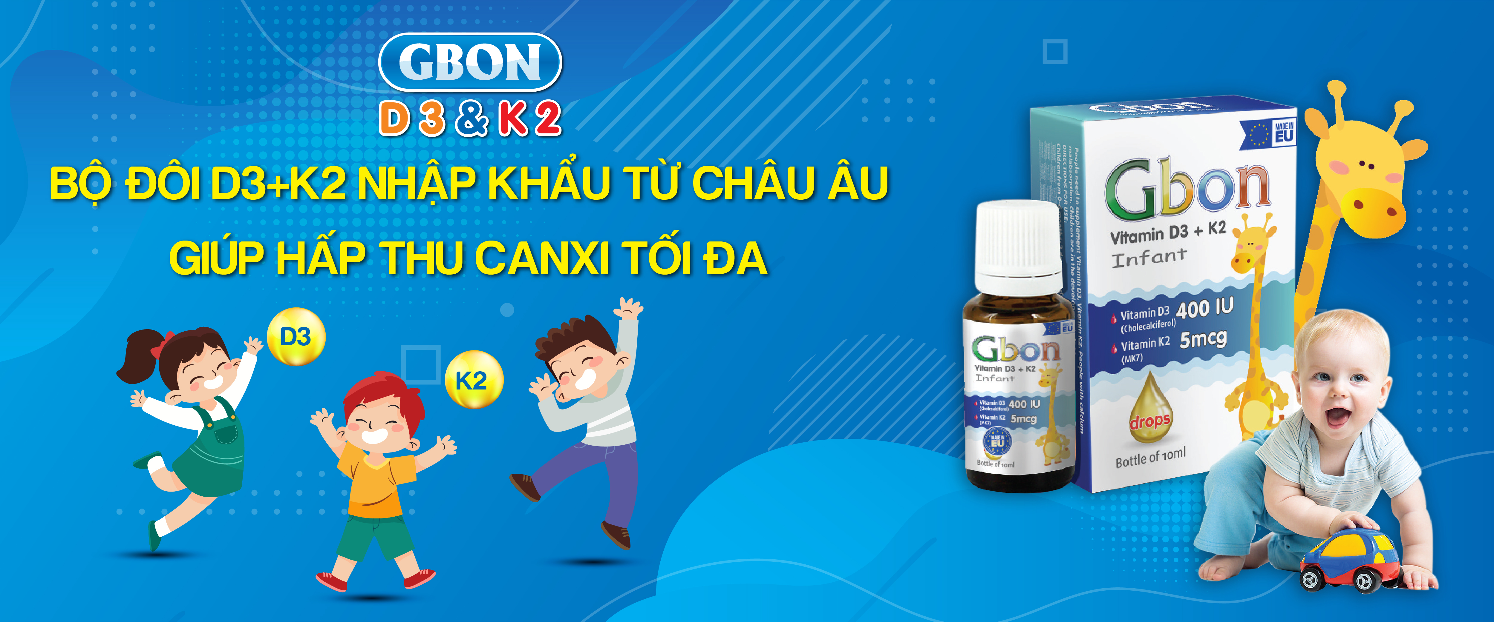 - Hỗ trợ phát triển chiều cao vượt trội cho trẻ sơ sinh và trẻ nhỏ. - Giúp trẻ phòng chống các bệnh lý còi xương, rối loạn giấc ngủ, trằn trọc, ngủ không sâu giấc, rụng tóc vành khăn do tình trạng thiếu canxi gây ra Thành phần có cả vitamin D3 và đặc biệt là thêm K2 hay còn gọi là MK7 giúp tăng hiệu quả hấp thu canxi vào xương, hỗ trợ tăng chiều cao tối đa Các mẹ hoàn toàn có thể yên tâm để sử dụng sản phẩm Gbon cho trẻ sơ sinh và trẻ nhỏ hàng ngày theo liều hướng dẫn, sẽ giúp bổ sung vitamin d3, k2 giúp trẻ phát triển toàn diện, tăng chiều cao tối ưu nhất là trong 1000 ngày đầu đời của trẻ Gbon có hàm lượng hoạt chất trong 5 giọt gồm: