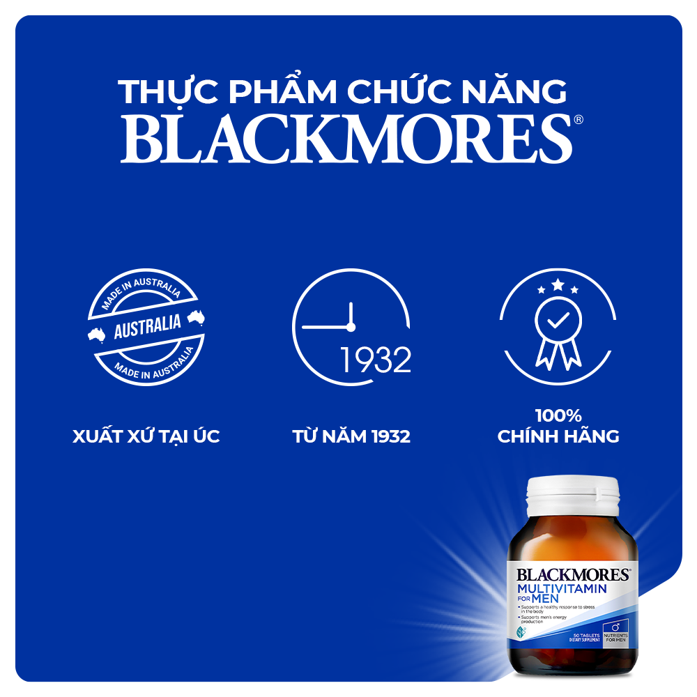 Blackmores là công ty dẫn đầu trong lĩnh vực chăm sóc sức khoẻ từ thiên nhiên của Úc được thành lập vào năm 1930. Dựa trên tầm nhìn và niềm đam mê của ông Maurice Blackmore – người sáng lập thương hiệu – Blackmores luôn nỗ lực tạo ra những sản phẩm bảo vệ sức khỏe từ các loại thảo mộc tự nhiên. Không chỉ gây ấn tượng về bề dày lịch sử và sự phát triển ổn định của công ty, Blackmores còn nỗ lực tạo ra nhiều hơn giá trị cộng đồng như bảo vệ môi trường, hỗ trợ cho cộng đồng, thúc đẩy tư duy đầu tư để có một cơ thể khỏe mạnh. Đến nay, Blackmores vẫn không ngừng nghiên cứu, tìm tòi để phát triển các sản phẩm mới nhằm mang đến sự chăm sóc tốt hơn cho sức khỏe khách hàng .