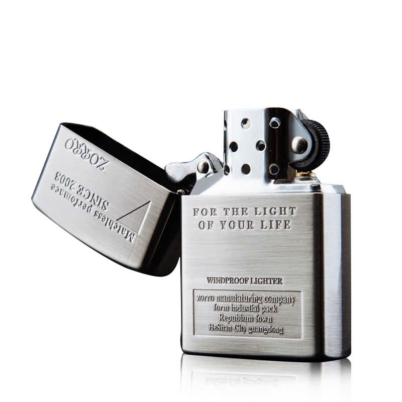 Bật lửa Zorro dùng xăng + đá (flint) Vỏ kim loại, phong cách retro, bền & dễ sửa Bật lửa Zorro dùng xăng (xăng bật lửa/chất lỏng nhẹ) kết hợp đá lửa (flint) — thiết