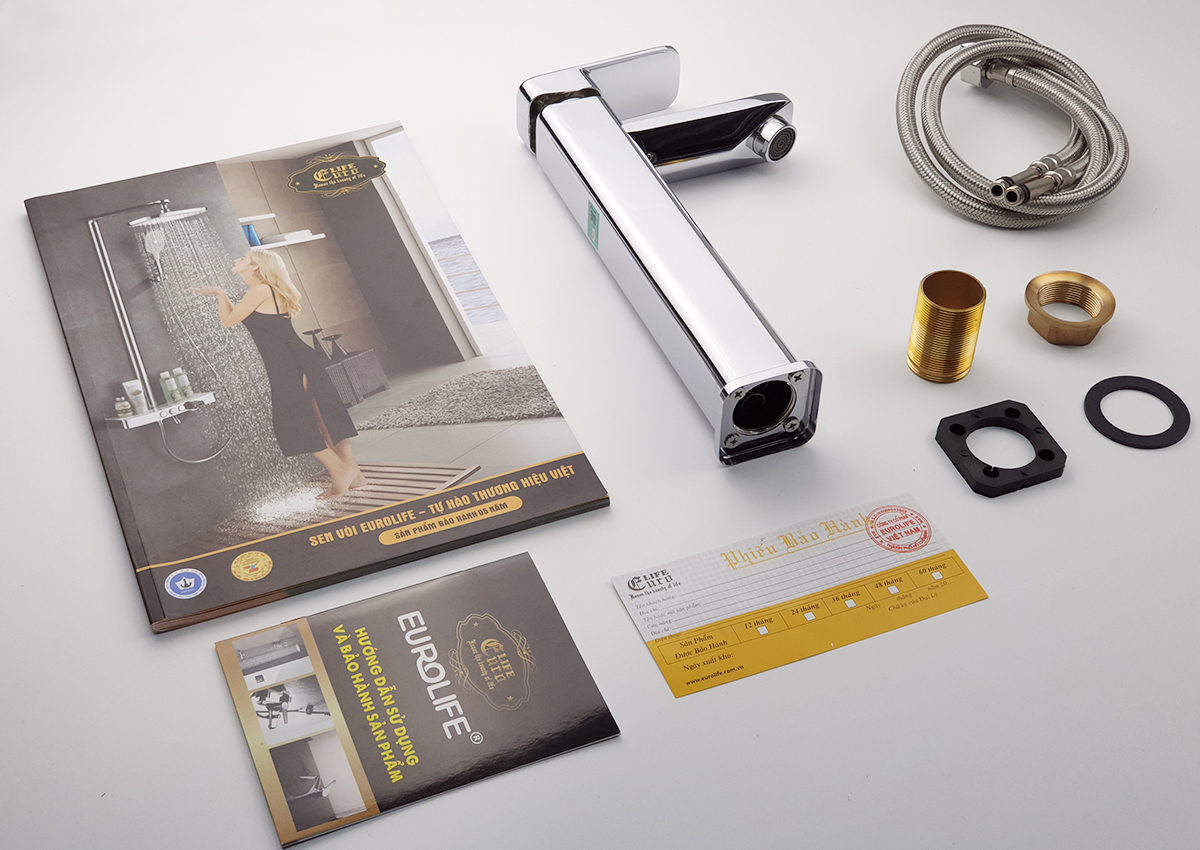• Bộ sản phẩm được đóng gói trong túi vải cotton, hộp màu riêng của Eurolife. Bộ sản phẩm đầy đủ bao gồm : Thân vòi Lavabo, 1 bát gắn, 2 roong cao su, 2 dây cấp 60cm, 1 phiếu bảo hành chính hãng.