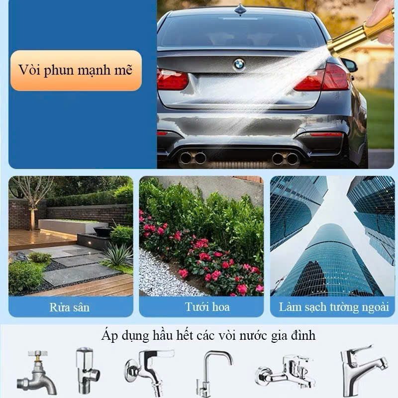 Tăng 300% áp lực nước so với vòi thường Vật liệu : đầu vòi bơm làm bằng đồng tạo độ chắc chắn, không hoen rỉ Đa chức năng Tưới cây, tưới hoa, rửa xe, vệ