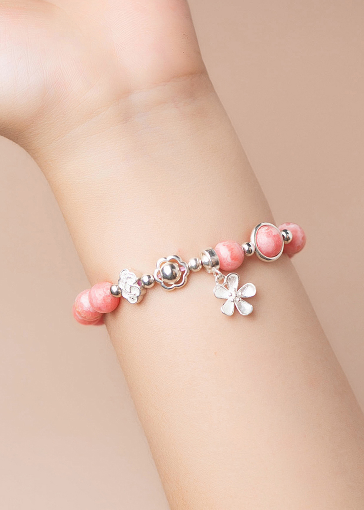 Vòng Tay Đá Rhodochrosite Phối Charm Hoa : Trong Hy Lạp, Đá Đào Hoa hay Rhodochrosite có nghĩa là màu hồng, biểu tượng của tình yêu trong văn hóa người Inca. Theo truyền thuyết, những viên đá màu hồng này được hình thành từ máu của các vị vua và hoàng hậu thời cổ đại.