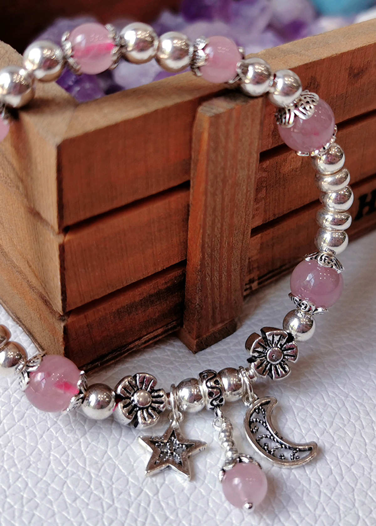 VÒNG TAY ĐÁ THẠCH ANH HỒNG PHỐI CHARM TRĂNG SAO:
