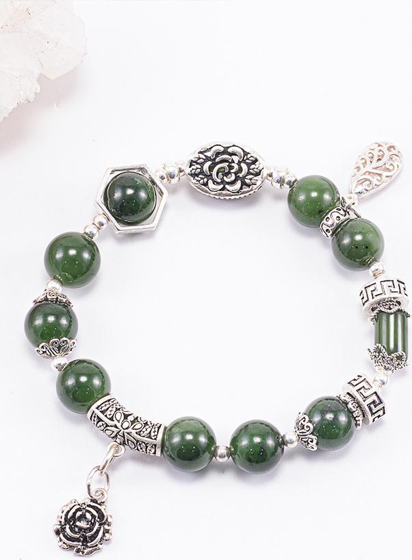 Vòng Tay Phong Thủy Nữ Đá Ngọc Bích Phối Charm Hoa Bạc (10mm) Mệnh Mộc, Hỏa