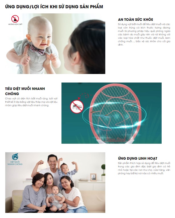 - Điện áp nguồn sạc: (150-250)V-50 Hz Điện áp đầu ra: ≥ 3.0 kV Công suất sạc điện (max): 0,8W Thời gian sạc đầy pin: (8-10) giờ Thời gian sử dụng bắt muỗi: (8-10) giờ Kích thước (DxRxC): (501x220x32.5)mm Lưới vợt thiết kế 3 lớp tiêu diệt muỗi nhanh chóng. Bộ vỏ ngoài làm bằng nhựa có độ bền cao, đảm bảo cách điện an toàn cho người sử dụng. Tay cầm chắc chắn khi sử dụng. Có đèn báo sạc tiện lợi và đèn báo cao áp khi sử dụng ở chế độ diệt muỗi. Sử dụng pin an toàn với môi trường, tuổi thọ cao, nạp xả được nhiều lần. Sản phẩm có 2 chế độ hoạt động: Diệt muỗi; Diệt muỗi và chiếu sáng bằng đèn LED. AN TOÀN SỨC KHỎE Sử dụng vợt bắt muỗi để tiêu diệt muỗi và các loại côn trùng có kích thước tương đương muỗi là phương pháp hiệu quả phòng ngừa các bệnh do muỗi gây nên và nói không với các loại hóa chất như thuốc diệt muỗi, kem chống muỗi…, bảo vệ sức khỏe cho cả gia đình. TIÊU DIỆT MUỖI NHANH CHÓNG Chao vợt có diện tích bắt muỗi rộng, lưới vợt thiết kế 3 lớp bằng vật liệu thép mạ và vật liệu nhôm giúp tiêu diệt muỗi nhanh chóng. ỨNG DỤNG LINH HOẠT Sản phẩm thích hợp sử dụng để tiêu diệt muỗi trong các gia đình đặc biệt gia đình có trẻ nhỏ hoặc tại các nơi như chợ, cửa hàng, văn phòng hay bất kỳ nơi nào có nhiều muỗi.