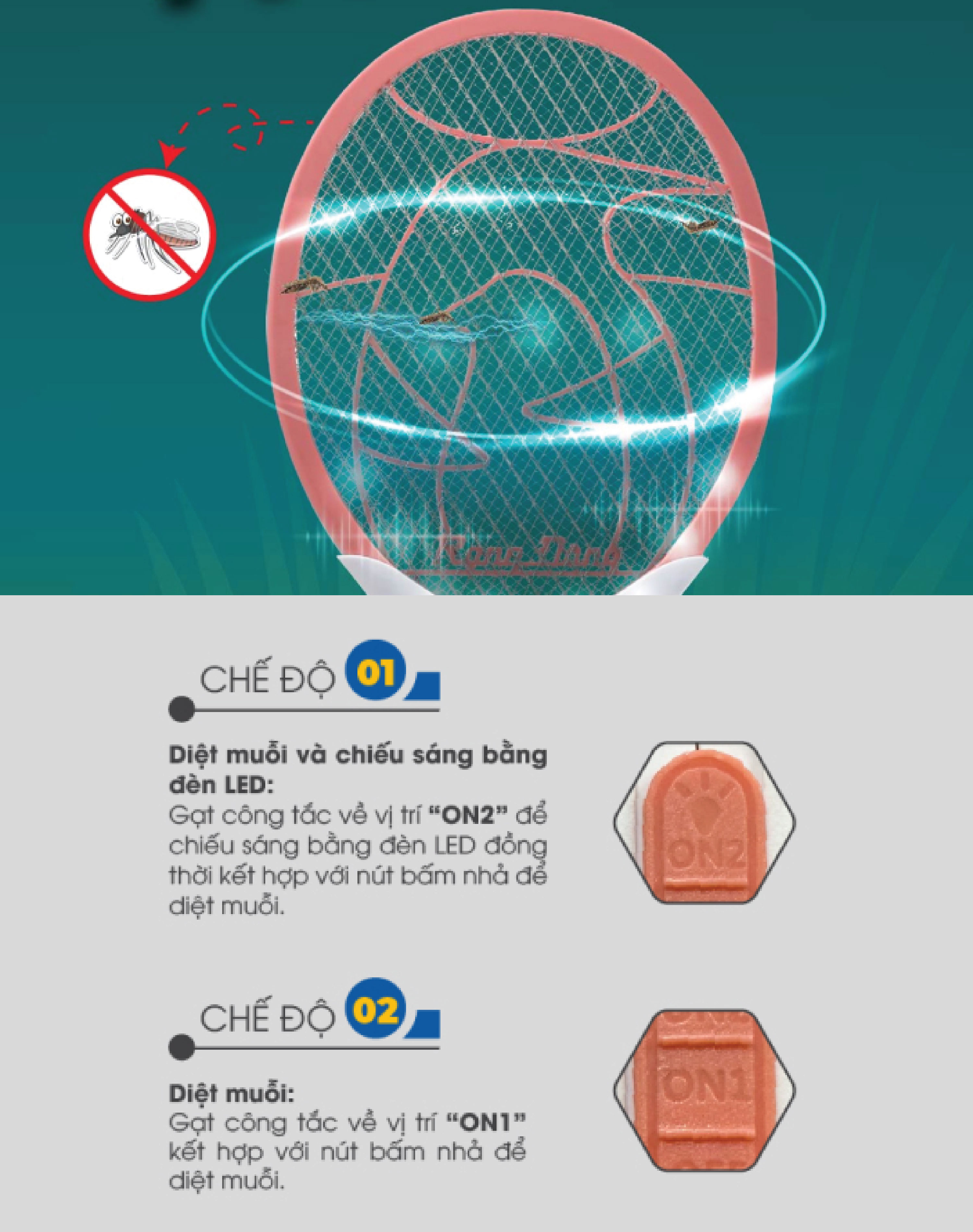 CÁCH SỬ DỤNG VỢT MUỖI KIÊM ĐÈN BẮT MUỖI HATACA WD 942: CHẾ ĐỘ VỢT MUỖI - Gạt công tắc nguồn về vị trí ON 1 - Nhấn và giữ nút bấm to để