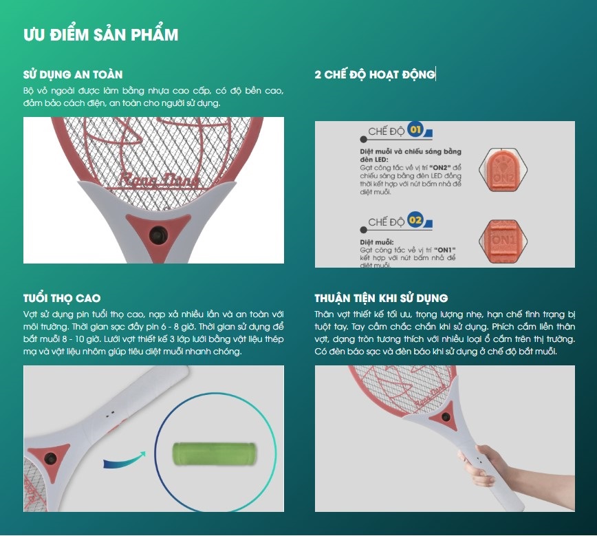 - Vợt Muỗi 2 Trong 1 Lithium Nakagami sử dụng Pin Lithium, có chất lượng tốt hơn, tuổi thọ pin bền hơn, dung lượng nhiều hơn, lâu hêt pin hơn. - Vợt muỗi cải tiến