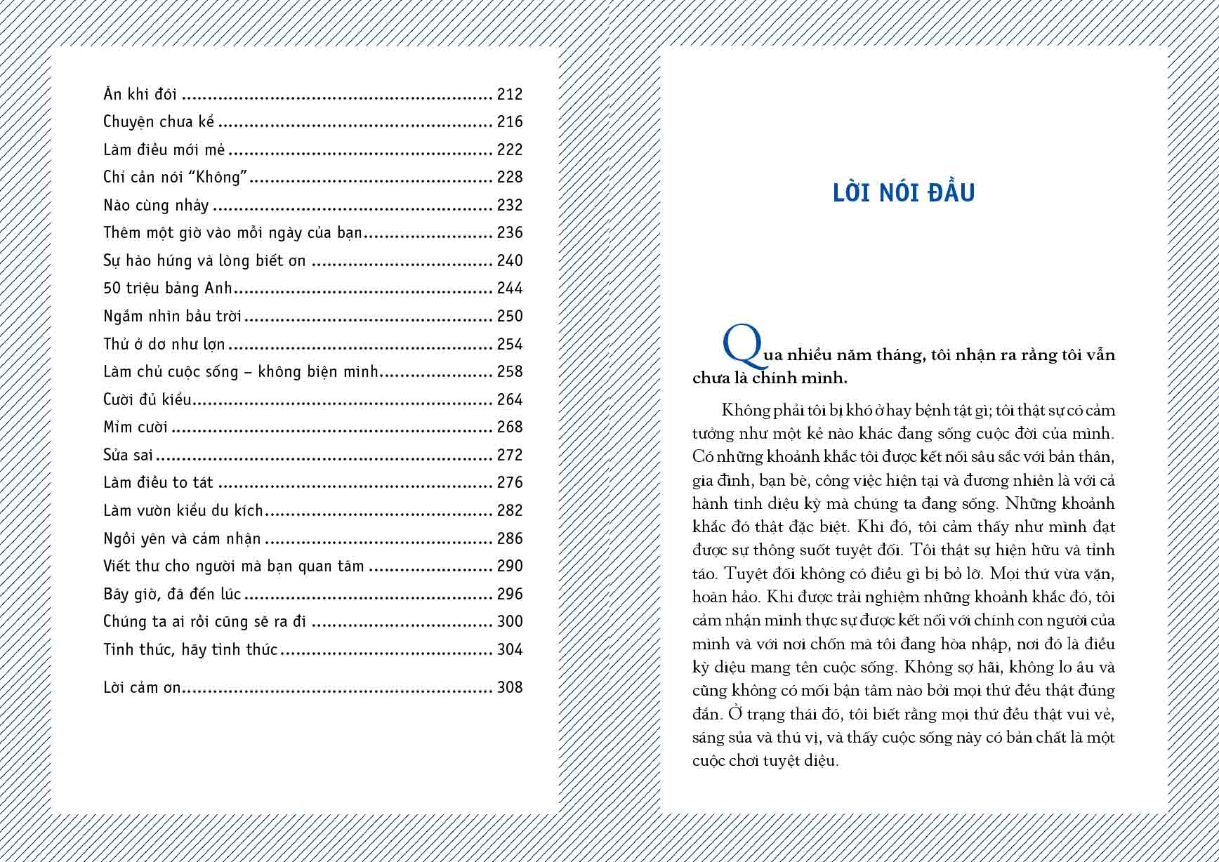 Cuốn sách bao gồm 56 lời gợi ý được chia ra thành các chủ đề: Hít thở, hòa nhịp, khơi nguồn sức mạnh, kết nối, lắng nghe cơ thể, lạc vào âm nhạc. Mỗi lời gợi ý được cấu trúc thành 3 phần: Góc nhìn mới, kế hoạch thực hiện, thành quả và một góc ghi chú cho bạn đọc.