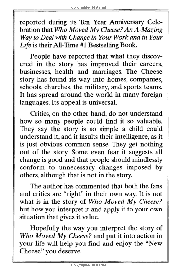 Who Moved My Cheese? Who Moved My Cheese? is an amusing and enlightening story of four characters who live in a maze and look for cheese to nourish them and make them happy. Cheese is a metaphor for ...
