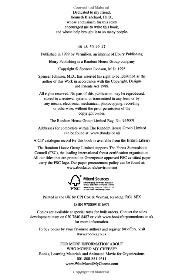 This profound book from bestselling author, Spencer Johnson, will show you how to anticipate change, adapt to change quickly, enjoy change and be ready to change quickly again and again. Discover the secret for yourself and learn how to deal with change, so that you suffer from less stress and enjoy more success in your work and in life. Written for all ages, this story takes less than an hour to read, but its unique insights can last for a lifetime.