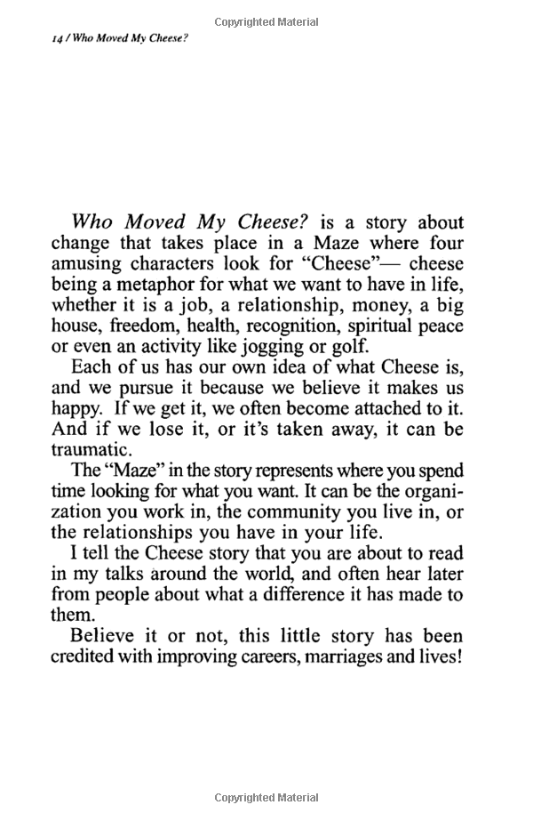 Who Moved My Cheese? is an amusing and enlightening story of four characters who live in a maze and look for cheese to nourish them and make them happy. Cheese is a metaphor for what you want to have in life - whether it is a good job, a loving relationship, money or a possession, health or spirital peace of mind. And the maze is where you look for what you want - the organisation you work in, or the family or community you live in.