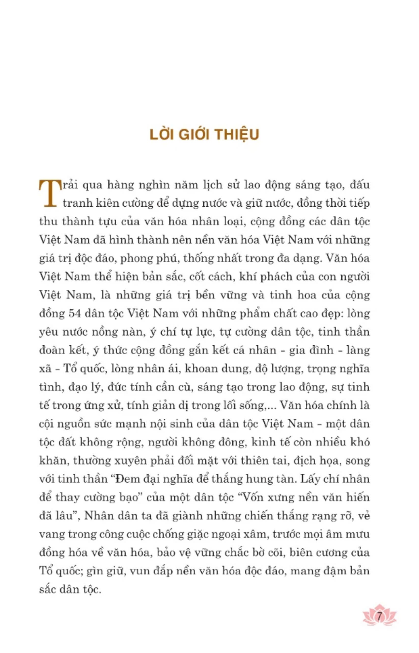 Cuốn sách tuyển chọn 92 bài viết, bài phát biểu, bài nói, lược ghi, trả lời phỏng vấn, thư của Tổng Bí thư Nguyễn Phú Trọng về xây dựng và phát triển nền văn hóa Việt Nam trong thời gian gần 60 năm qua. Nội dung các bài phát biểu, bài viết thể hiện sự quan tâm sâu sắc của đồng chí Tổng Bí thư đối với việc xây dựng, giữ gìn và phát triển nền văn hóa Việt Nam với các yếu tố truyền thống và hiện đại, bản sắc và hội nhập, tạo nguồn lực nội sinh và huy động sức mạnh của văn hóa, con người Việt Nam trong công cuộc xây dựng, phát triển đất nước phồn vinh, thịnh vượng.