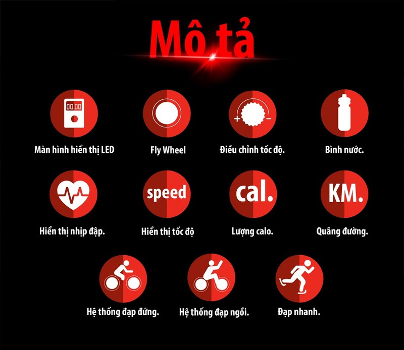 Trọng lượng tối đa người sử dụng: 125kg Cốt thanh tay cầm và yên xe bằng crom Màn hình LED hiển thị trực quan, dễ dàng quan sát Trang bị giá đựng chai nước và