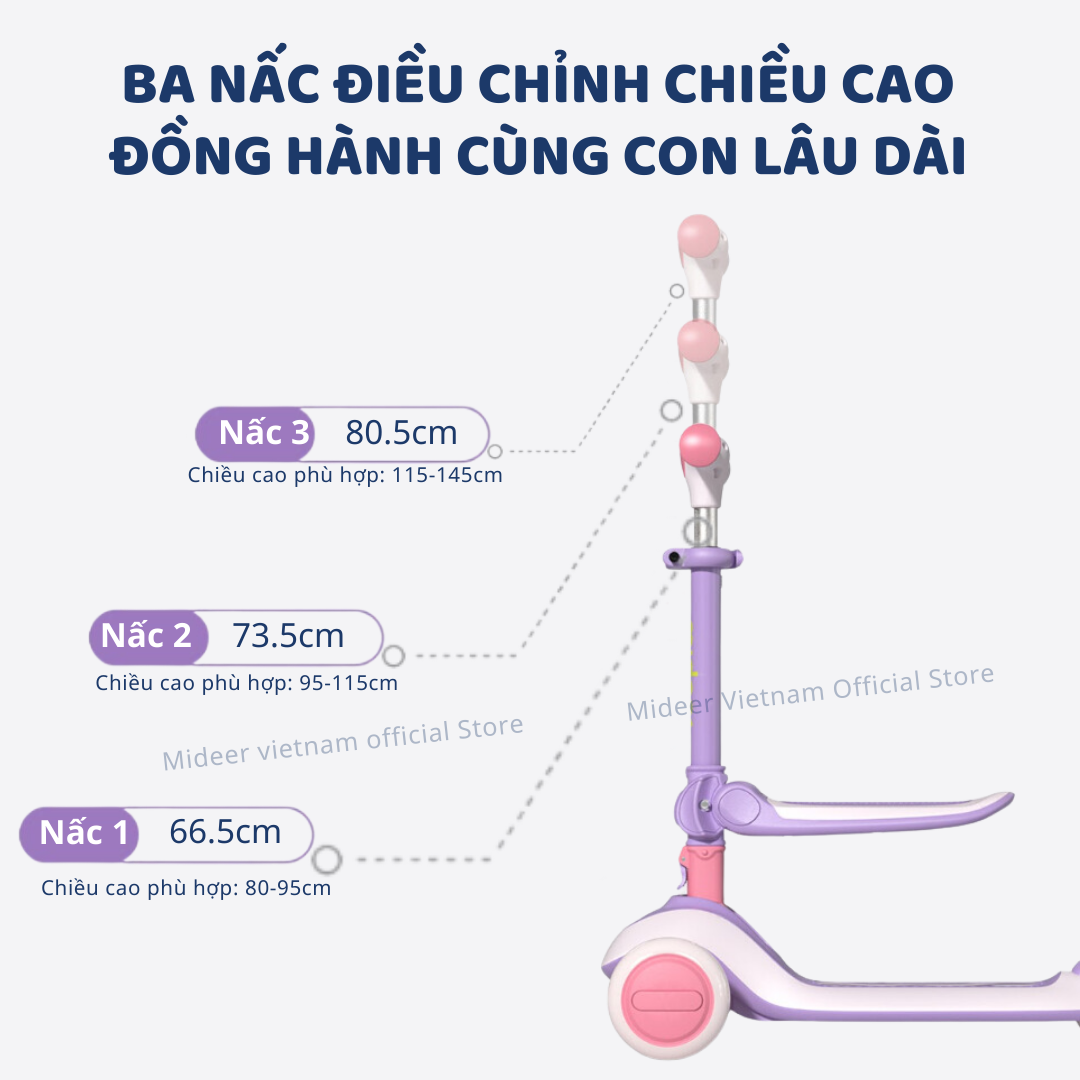 1 .BA NẤC ĐIỀU CHỈNH CHIỀU CAO- NGƯỜI BẠN ĐỒNG HÀNH PHÁT TRIỂN TOÀN DIỆN: Với ba mức chiều cao có thể điều chỉnh, phù hợp cho trẻ từ 1 đến 14 tuổi tướng ứng với chiều cao từ 80 đến 145cm Chỉ với một chiếc xe, bé có thể phát triển cùng bạn bè và gia đình qua từng giai đoạn trưởng thành.