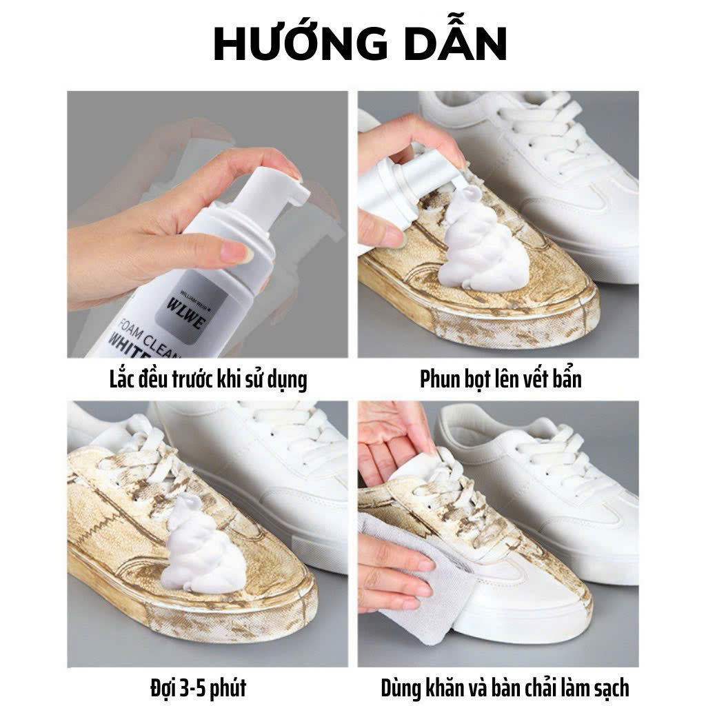 - Khôi phục giày cũ: Đầu xịt giúp làm sạch và tẩy trắng giày một cách hiệu quả, giúp giày thể thao của bạn trở lại trạng thái như mới, đồng thời phục hồi lớp da và màu sắc giày. Hướng dẫn sử dụng: